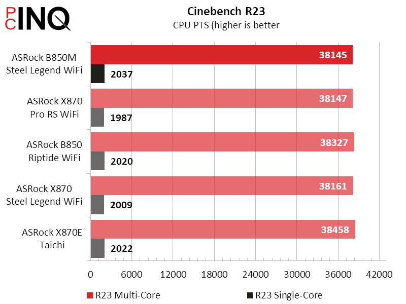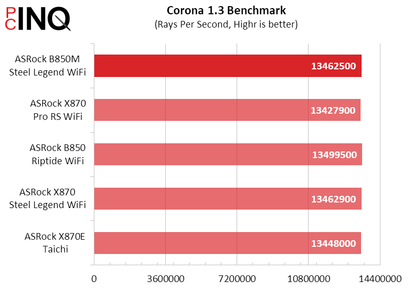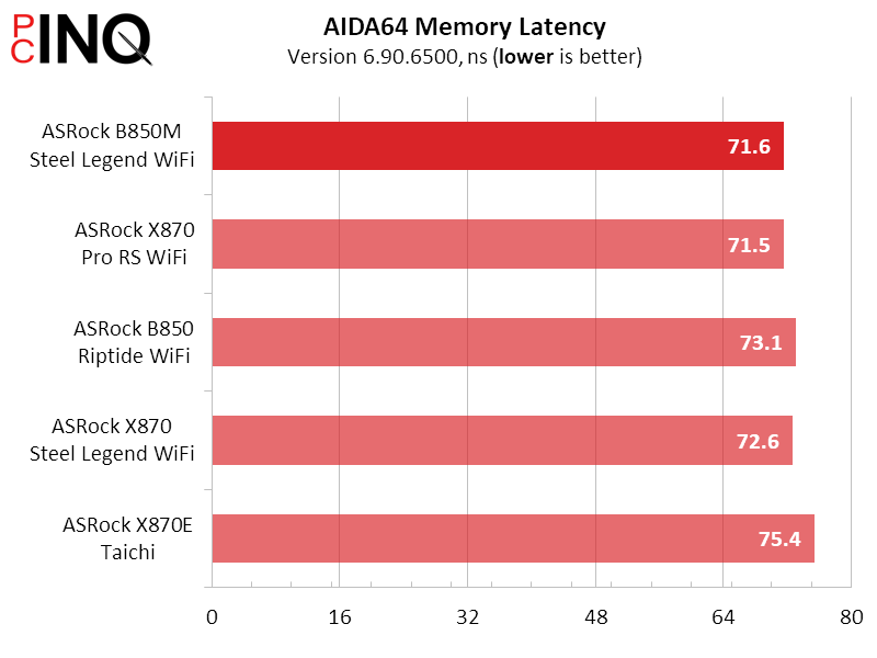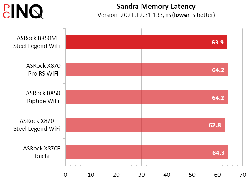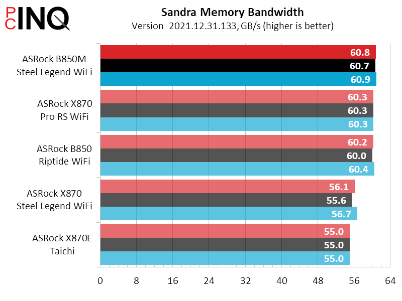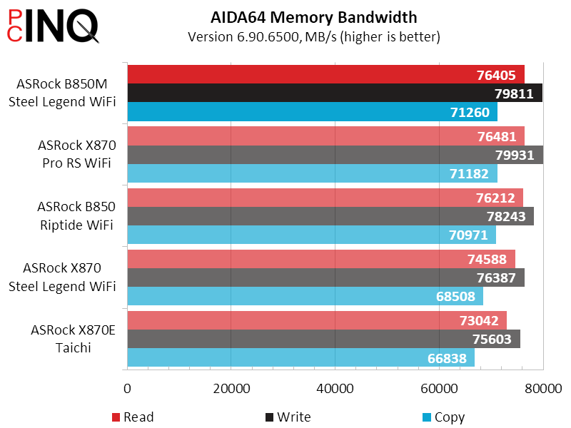 We’re not sure why but we think we can tie it to ASRock’s continuous updates in BIOS: The B850M Steel Legend WiFi, being the most recent board to hit our bench, has the most recent BIOS and highest Sandra Memory Bandwidth. It does take second place to the second most recent board in AIDA64, but these were only tested weeks apart.