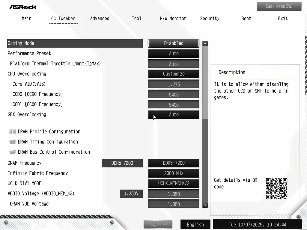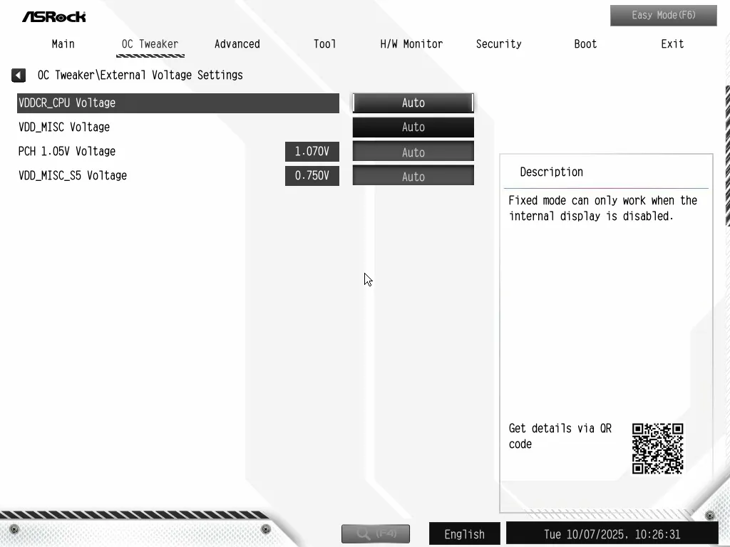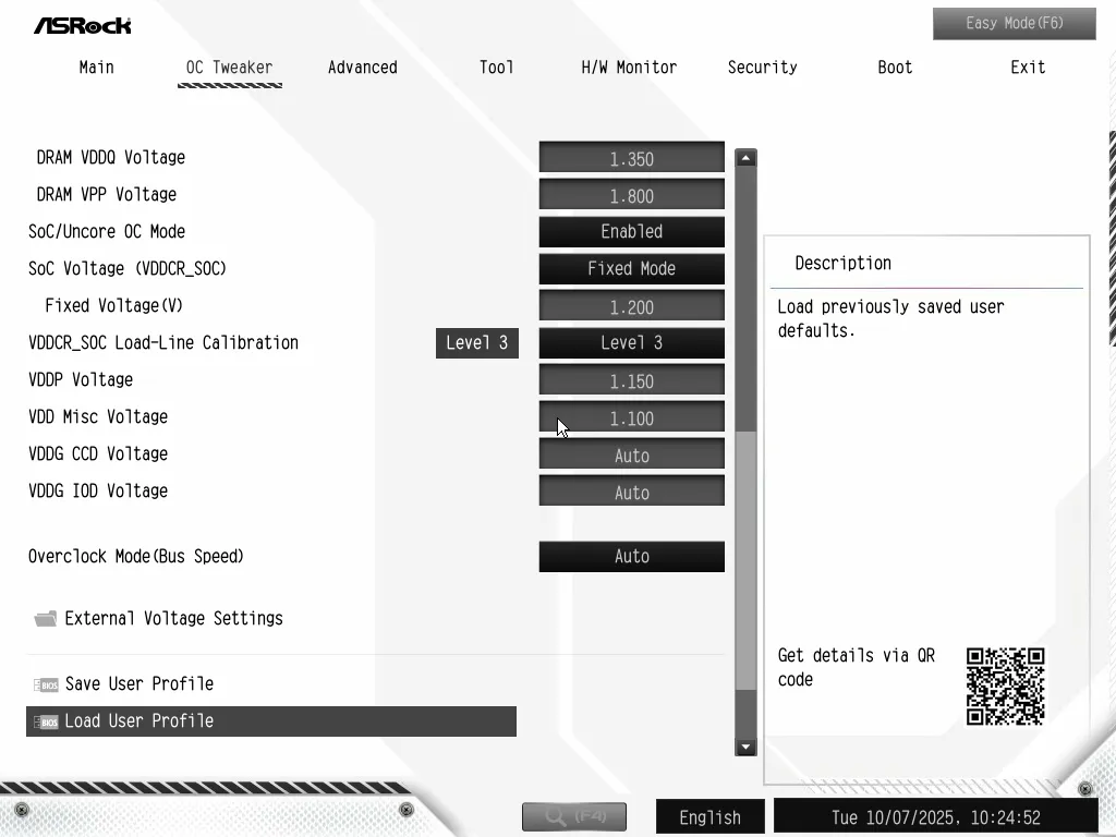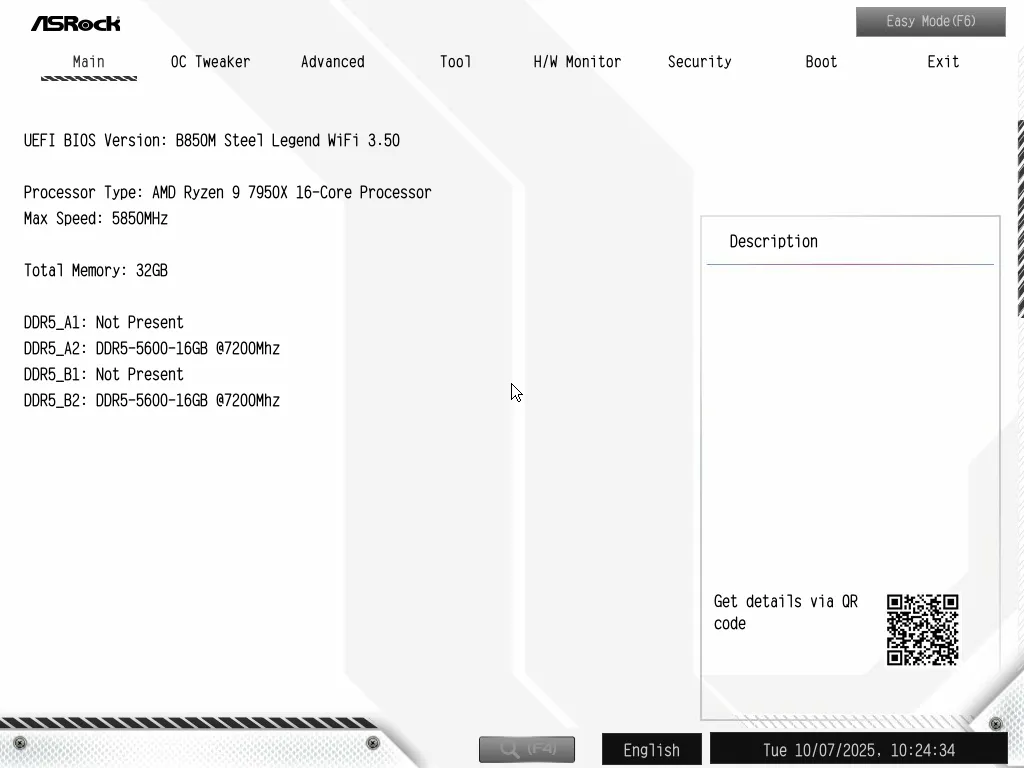 The latest B850M Steel Legend WiFi firmware opens to the Main menu of its Advanced Mode interface by default, though users can jump to the simplified Easy Mode interface by pressing their keyboard’s F6 function key. We quickly jumped to the next menu, OC Tweaker, before proceeding.