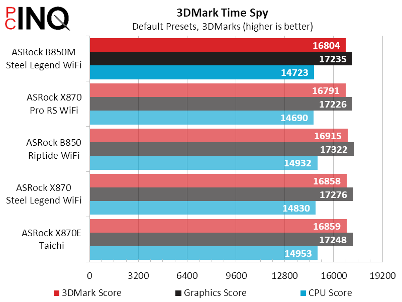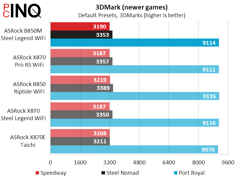 We’ve retained the classic Time Spy test in 3DMark but added the more recent Speedway, Steel Nomad and Port Royal tests to our third 3DMark Chart. The B850M Steel Legend WiFi doesn’t stand out in any of those, but the Game Loads test appears to benefit from the application of AMD’s most-recent chipset driver.