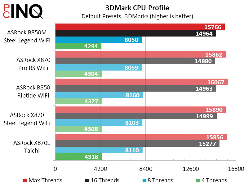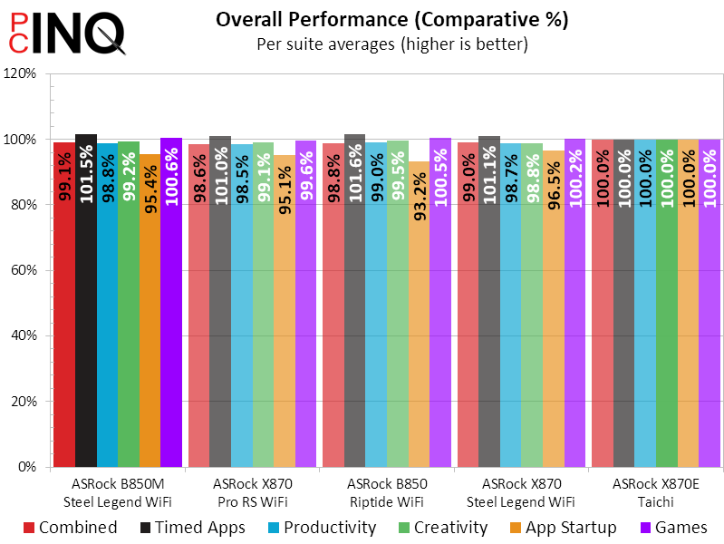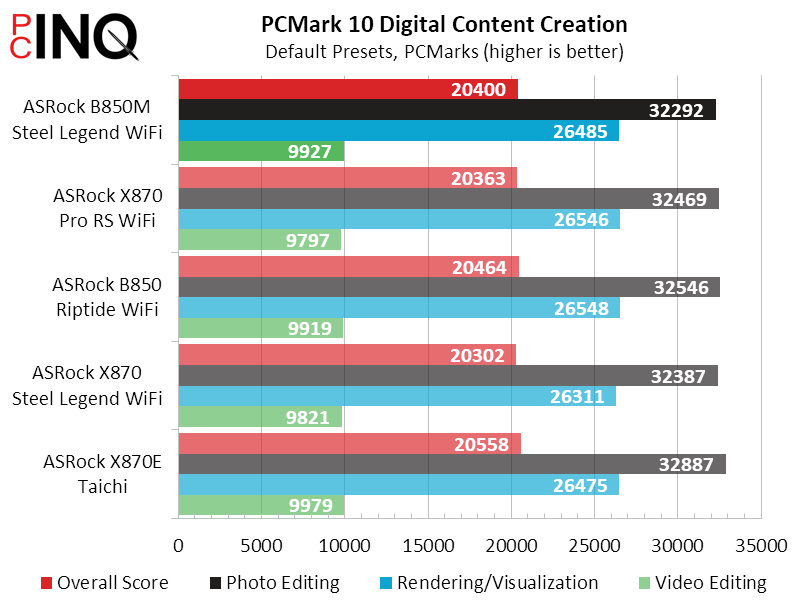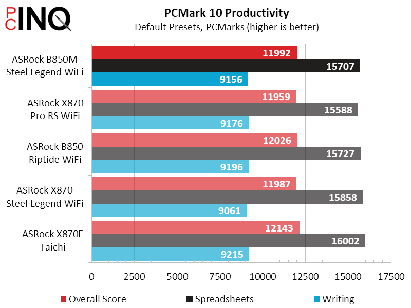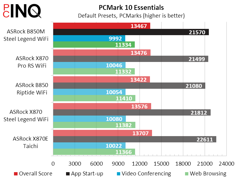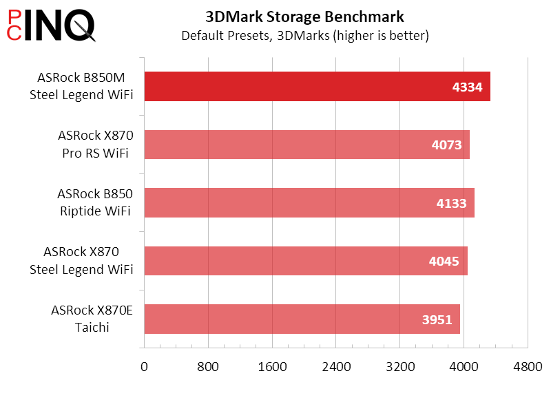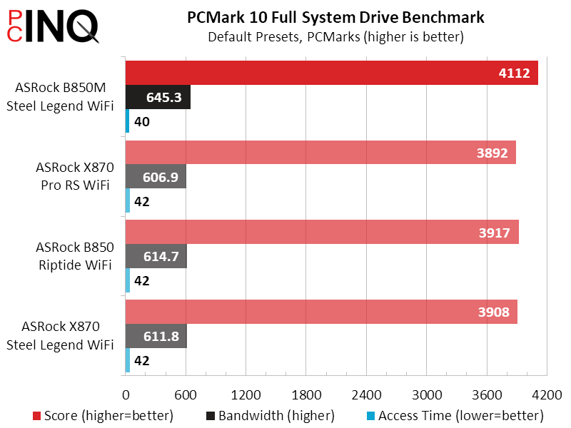 PC Mark favors the oldest tested board in some metrics, but we think that goes back to the bad old days of high power settings and eventual burned processors. The B850M Steel Legend WiFi achieved its highest storage marks, but that just points back to the application of AMD’s newest chipset driver.