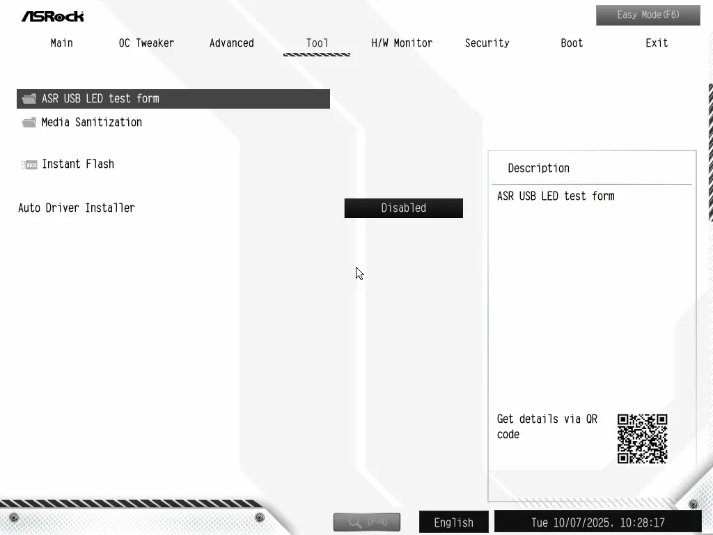 The B850M Steel Legend WiFi has fewer “Tools” in the Tool menu than most of the firm’s boards, but we still used its ARGB and Instant Flash utilities. Its “Auto Driver Installer” automatically installs a driver download tool into windows the first time it detects an internet connection and then sets itself to “disabled”, but it can also be manually disabled if you don’t want the board to automatically download new Windows drivers.