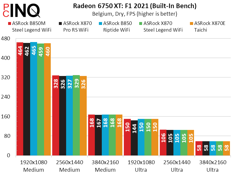 F1 2021 is only memory handicapped at far lower data rates, so we shouldn’t expect to see much difference when using DDR5. The B850M Steel Legend WiFi still does well here, for what that’s worth.