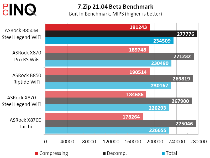 The higher memory bandwidth that only popped up in Sandra among our pure synthetics shows itself again in 7.Zip, both in its synthesized and real-world timed tests. The new board stands out in no other timed benchmarks, for either better or worse.