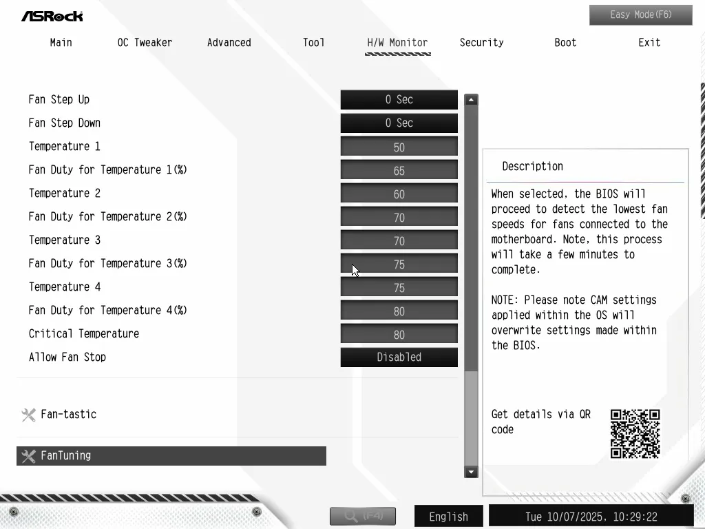 The H/W Monitor menu provides a reasonably broad selection of critical readings along with fan controls for all five of the board’s headers. Users are welcomed to select from four default fan profiles, create their own profile numerically, pick a slope visually using the Fan-Tastic popup menu, or let the board adjust its default profiles to match your fans using its FanTuning algorithm.