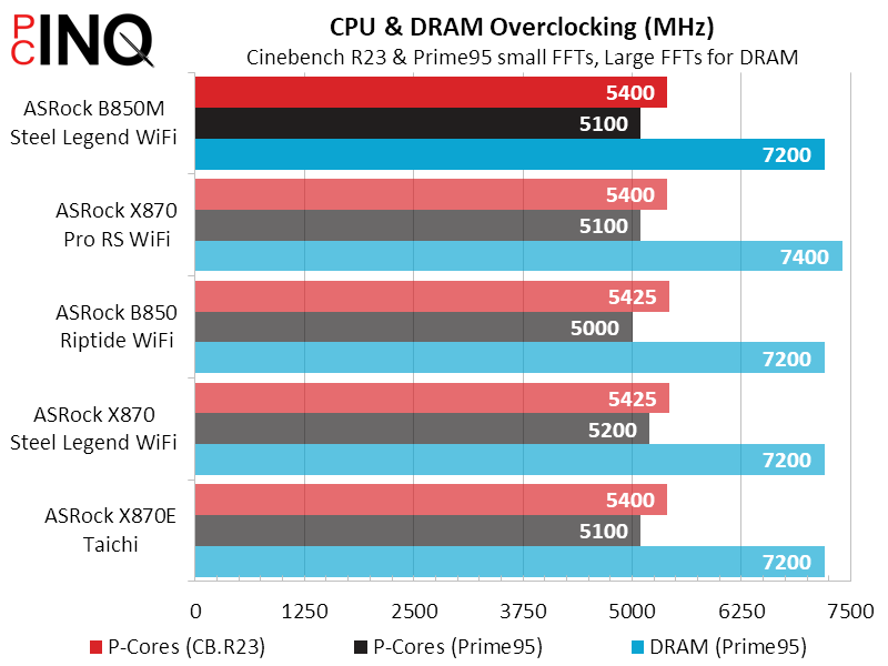 AMD uses overclocking techniques to boost the maximum and average frequencies of its high-end processors, so when you hear of a “stock” rating of “up to” 5.85GHz you should remember that these are instantaneous and only for one or two cores at a time. Our CPU appears capable of 5400MHz at a continuously high all-core load and 5100MHz at a constantly extreme load, and the B850M Steel Legend WiFi isn’t fixing that. Meanwhile the X870 Pro RS WiFi was the only Socket AM5 board to push our memory past DDR5-7200.