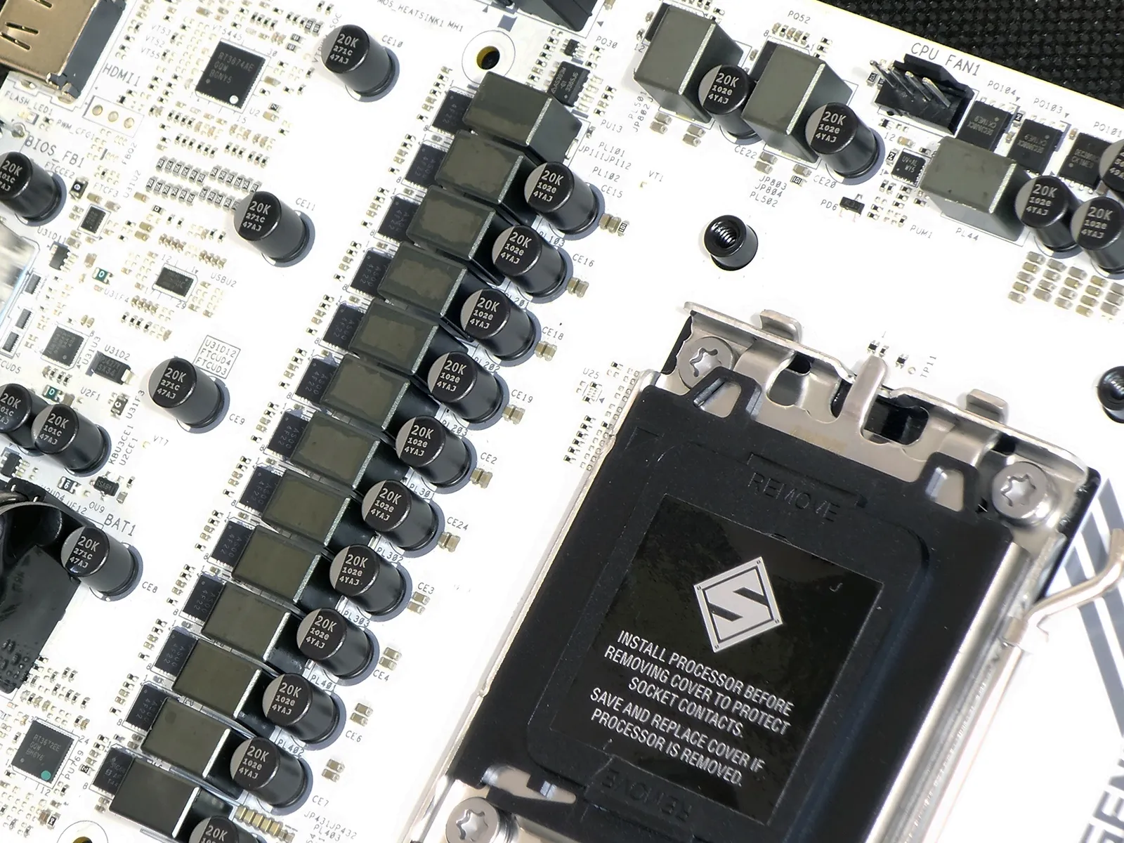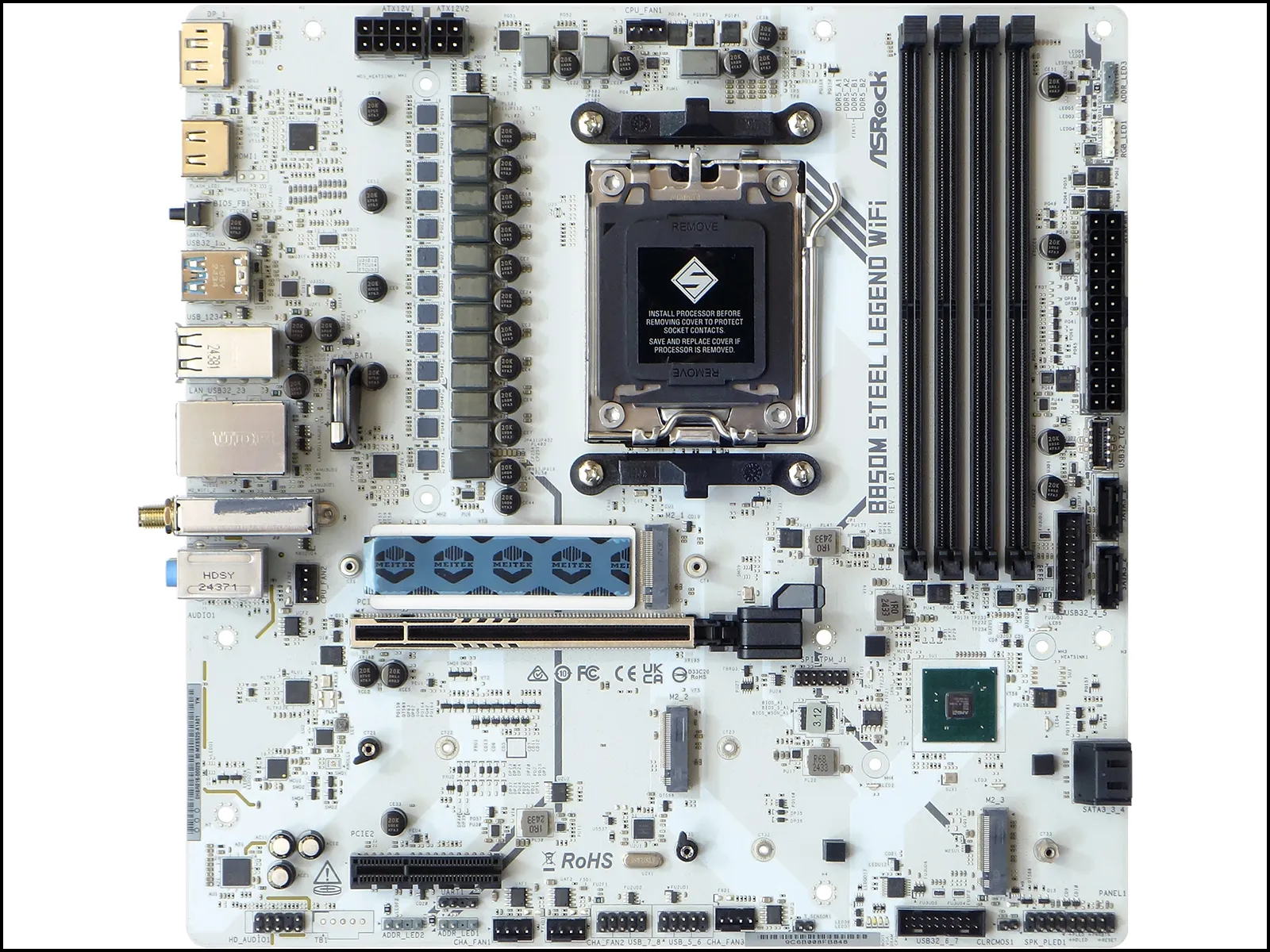 Moving the B850M Steel Legend WiFi’s slot one position northward compared to the full-ATX version forced ASRock to make another design decision regarding placement of the board’s Gen5 NVMe slot: Rather than move the drive interface, the firm decided to reduce its voltage regulator from fourteen to twelve CPU phases. That should never be a problem since each phase is supposedly capable of supplying 60A, but it is a factoid.