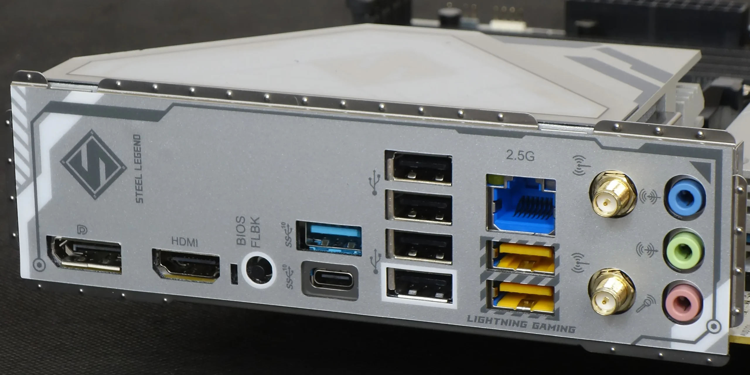 ASRock has recently dropped the optical audio connector from the back of most boards, and by substituting it for a third analog audio jack has re-enabled the traditional way to configure 5.1 surround for gaming. We also see a DisplayPort 1.4 and HDMI 2.1 connector that each support a maximum 4k/120Hz display, a BIOS Flashback button to ease flashing a compatible firmware without the need for compatible hardware, two 10Gbps USB ports in a mix of Type A and Type-C flavors, four USB 2.0 ports, a Realtek-fed 2.5GbE Ethernet port, two USB 3.1 Gen1 (5Gbps) ports and a pair of antenna jacks for the factory installed MediaTek RZ717 WiFi 7 module.