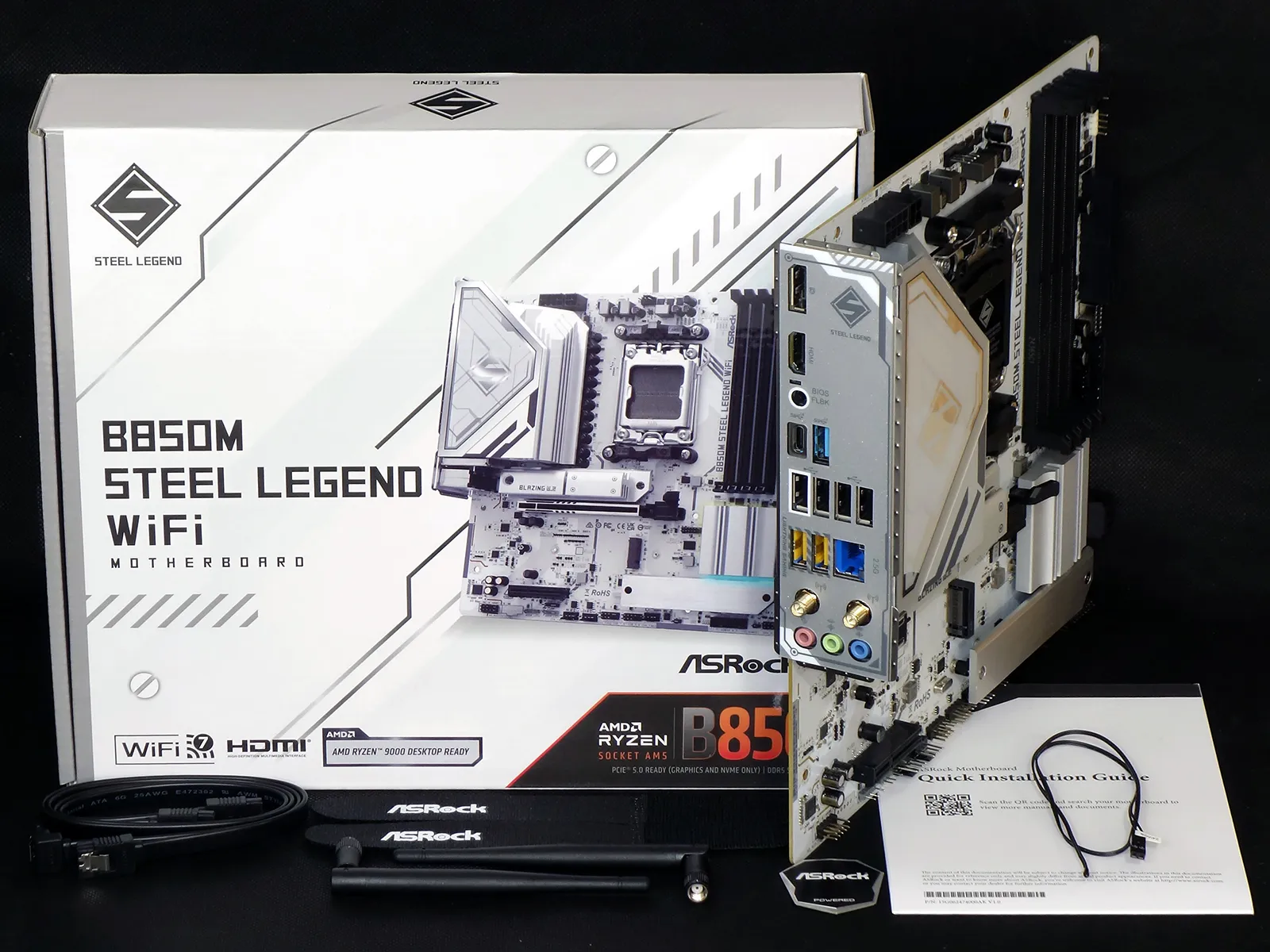 In addition to the motherboards, ASRock’s B850M Steel Legend WiFi package includes two SATA cables, a pair of hook & loop cable straps, two Wi-Fi antenna, a case badge, a quick installation guide and a thermistor lead.
