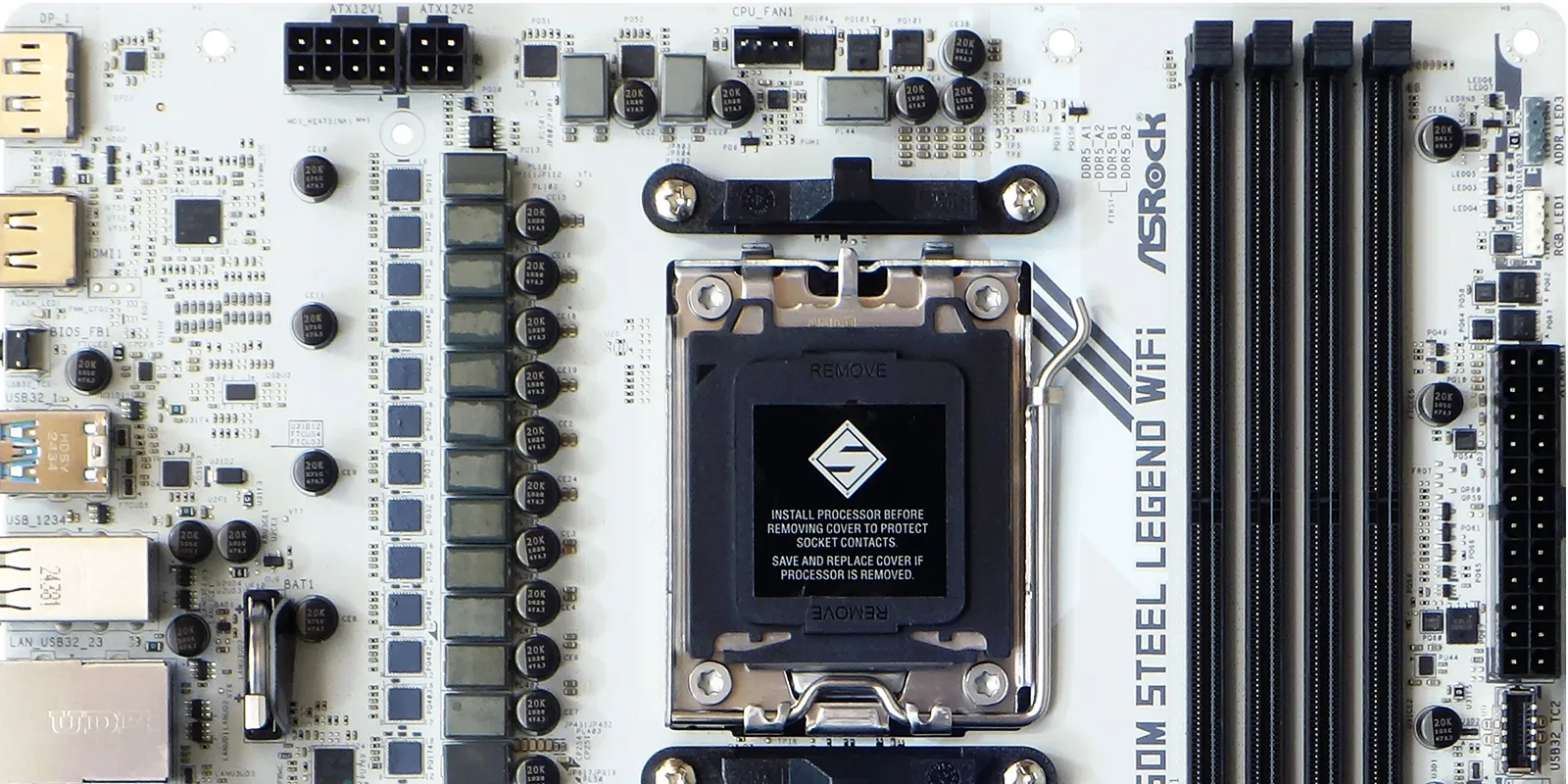 Moving the B850M Steel Legend WiFi’s slot one position northward compared to the full-ATX version forced ASRock to make another design decision regarding placement of the board’s Gen5 NVMe slot: Rather than move the drive interface, the firm decided to reduce its voltage regulator from fourteen to twelve CPU phases. That should never be a problem since each phase is supposedly capable of supplying 60A, but it is a factoid.