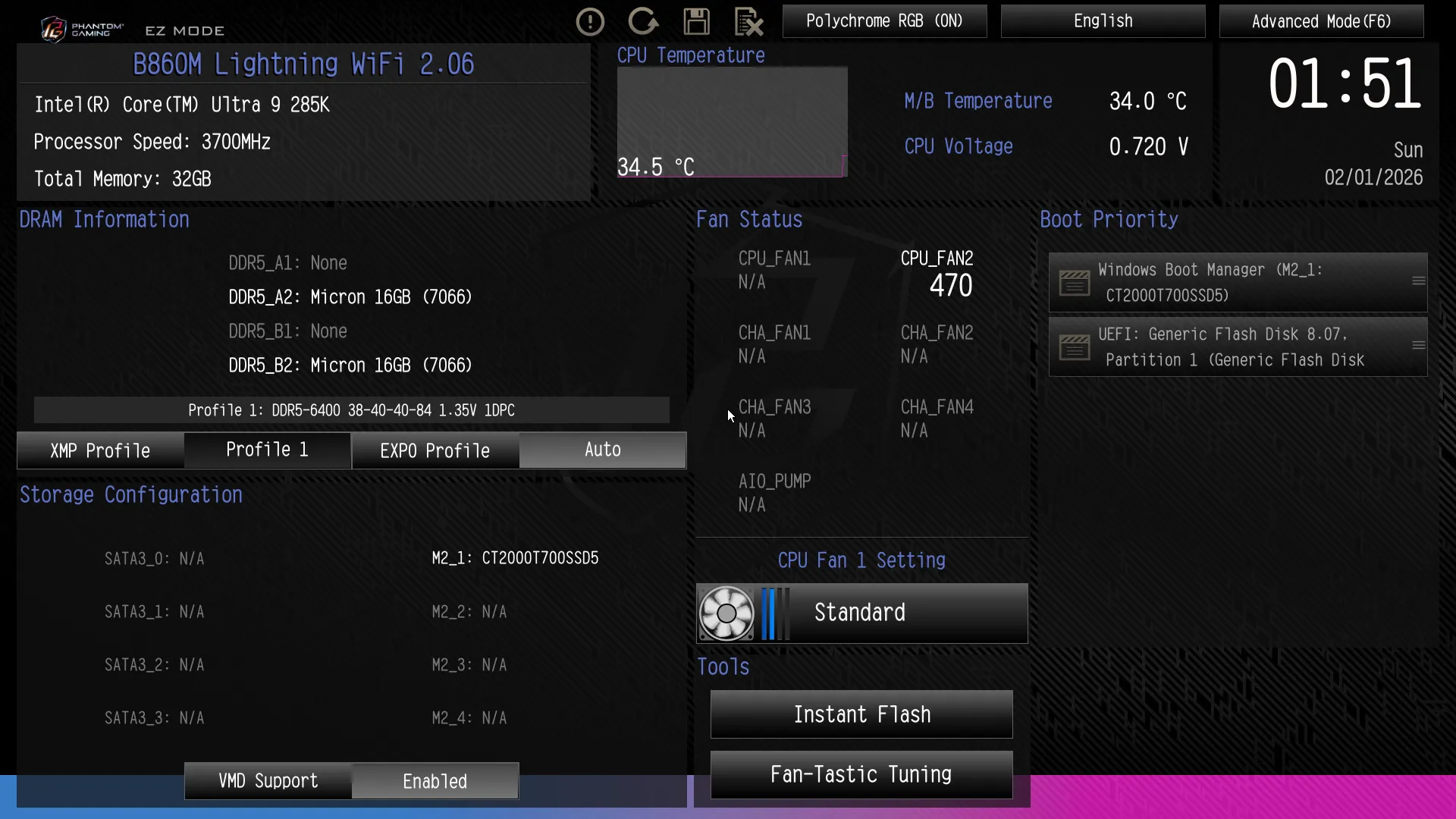 By default, the B860M Lightning WiFi’s UEFI opens to an “Easy Mode” menu where users can set an XMP profile, change boot order, chose a factory fan profile, access Instant Flash update utility and its Fan-Tastic manual fan slope adjustment popup.
