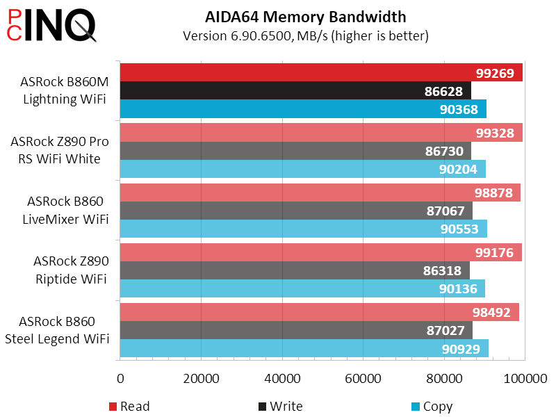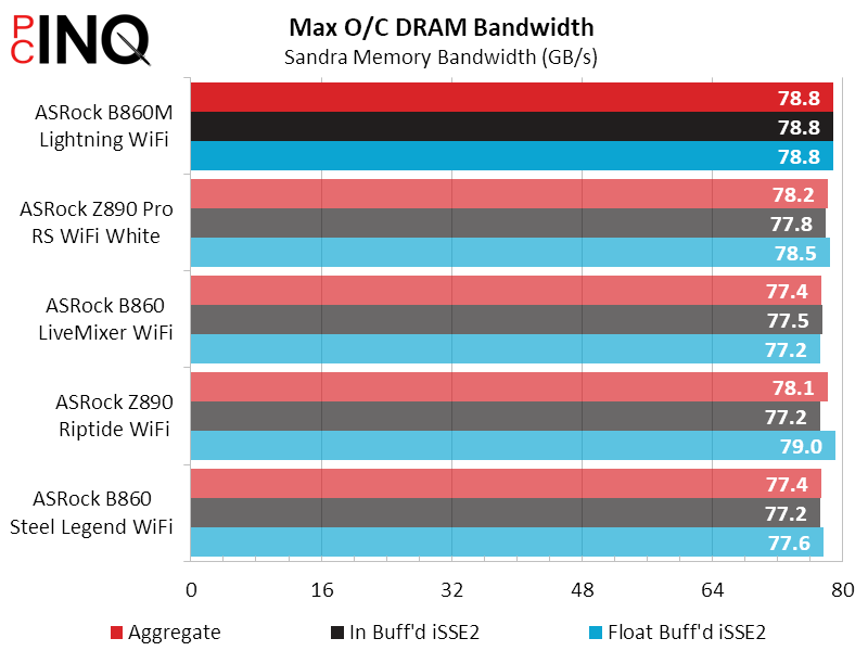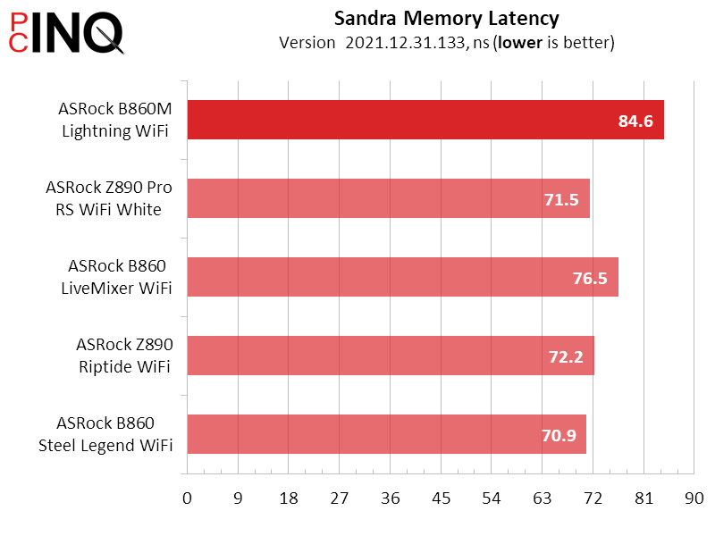 As DRAM is the only part of a B860 board that can be overclocked, we appreciate that the B860M Lightning WiFi help us push our Crucial DDR5-6400 C38 a little farther than any board that preceded it. Proving that it didn’t get there via any timing tricks, its overclocking win is reflected in Sandra’s latency-sensitive bandwidth test.