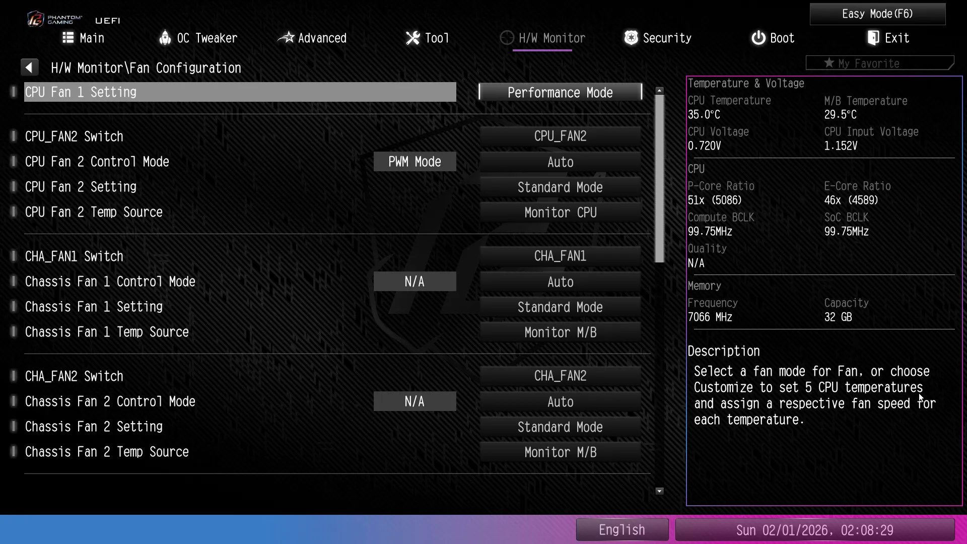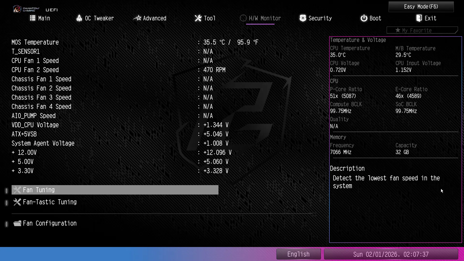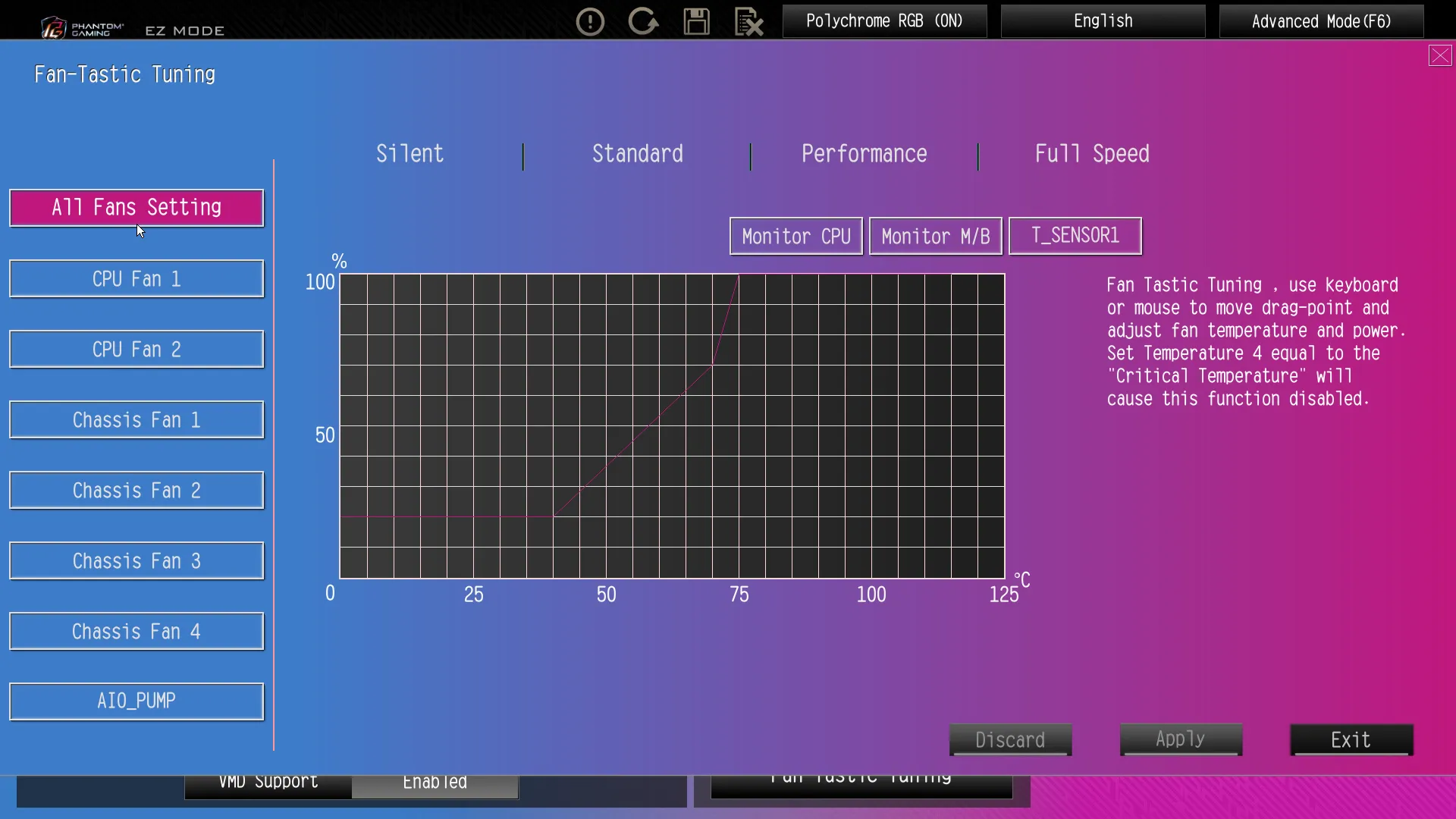 The H/W Monitor menu displays tachometer readings for all seven PWM (fan) headers (one’s labeled for pumps), along with a couple important temperature and a few more voltage readings. At the bottom it offers us the Fan Tuning testing algorithm to adjust the factory slops to match your specific fans (don’t click this unless you want to wait for it to finish), a shortcut to the previously discussed Fan-Tastic fan slope popup, and a submenu for selecting each fan’s factory profile or manually adjusting it via numeric values.