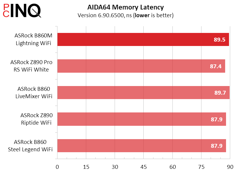 We see an oddity in measured latency on two of the B860 boards, but we’ve yet to determine the cause. Retesting proved the results consistent, and all of our tools showed proper XMP timings had been deployed.