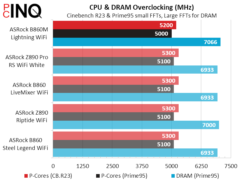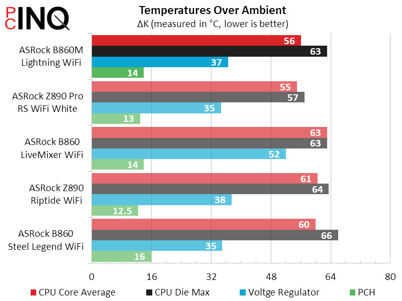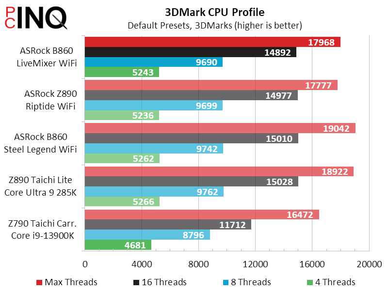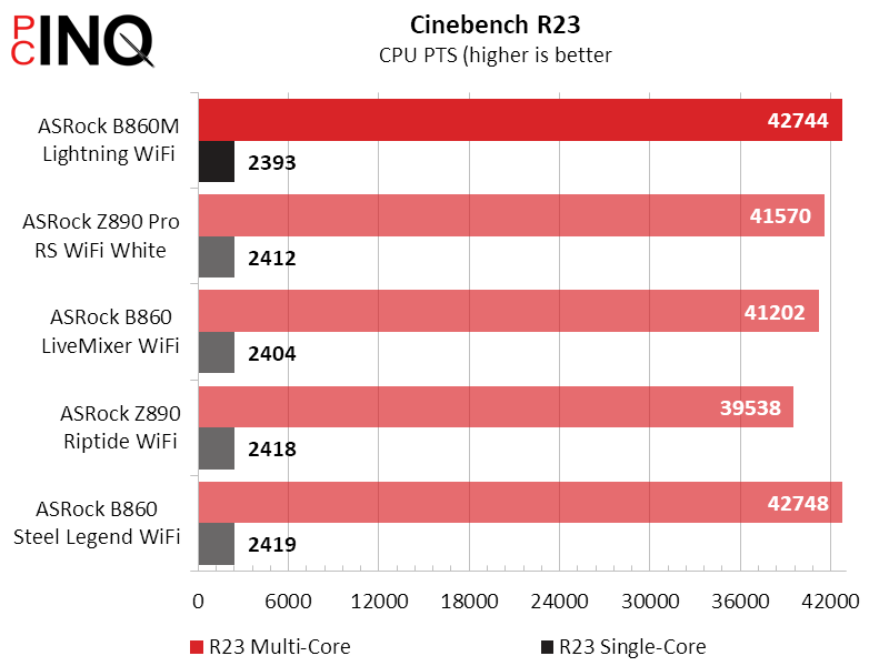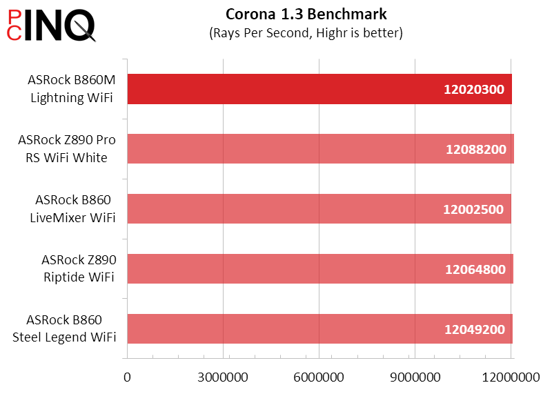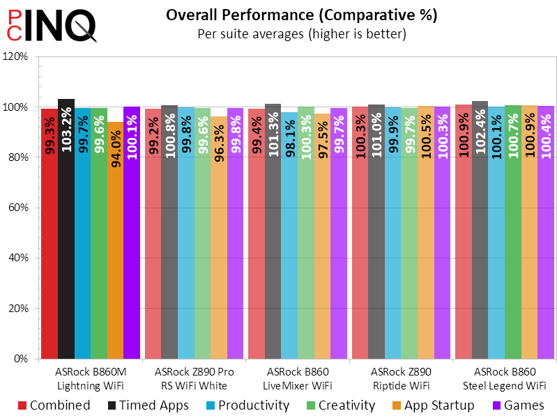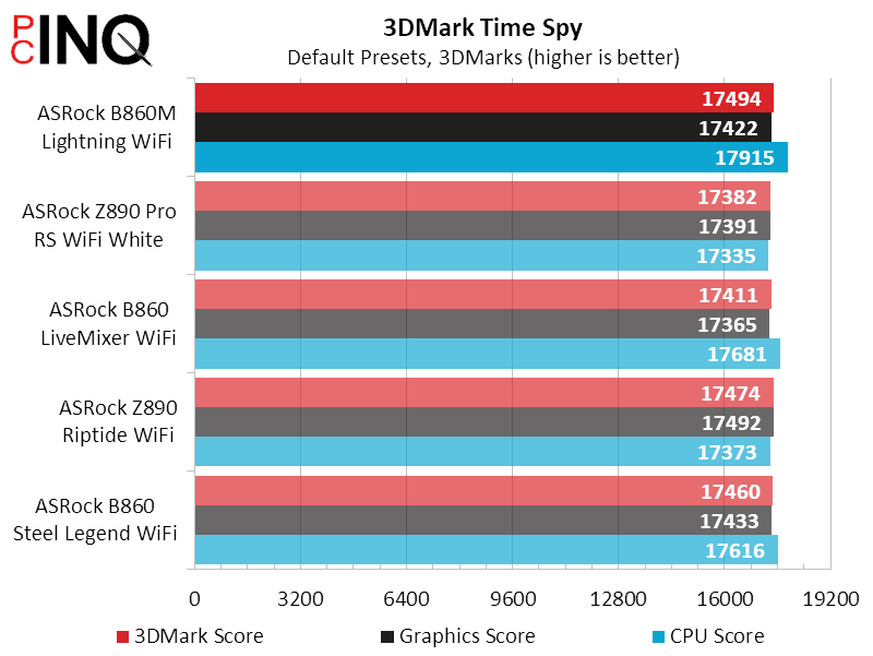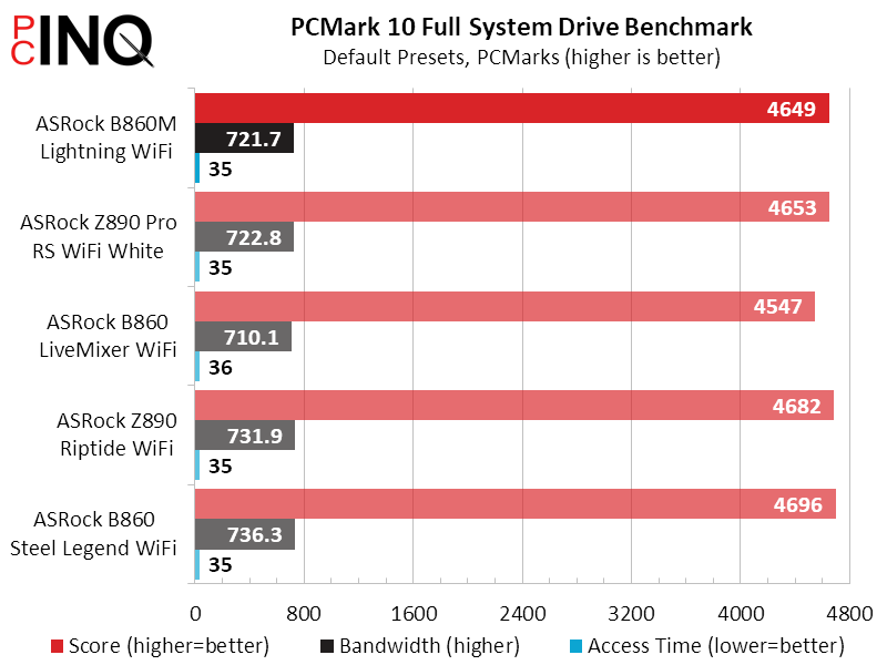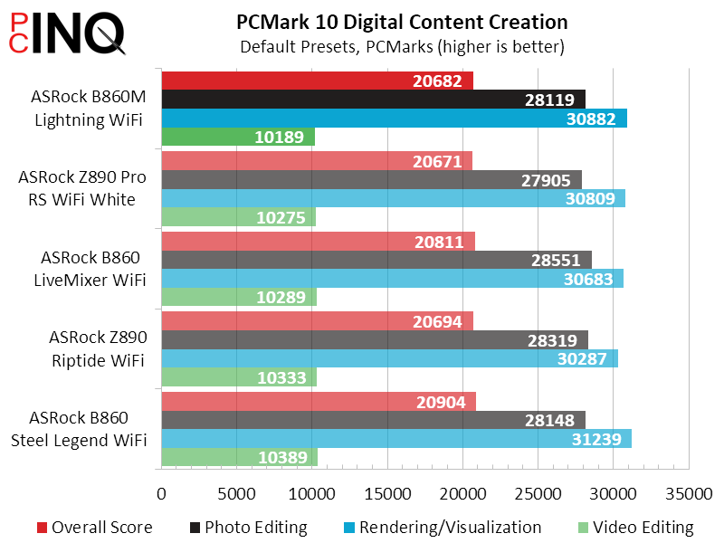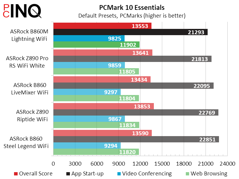 Differences between motherboards are even narrower in PCMark, where the B860M Lightning WiFi always appears near the top but never at the top.