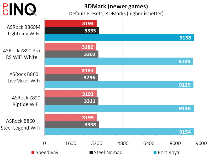 3DMark results are fairly scattered within a narrow range, the B860M Lightning WiFi winning some but losing a few more against the four most recent LGA-1851 motherboards to come before.