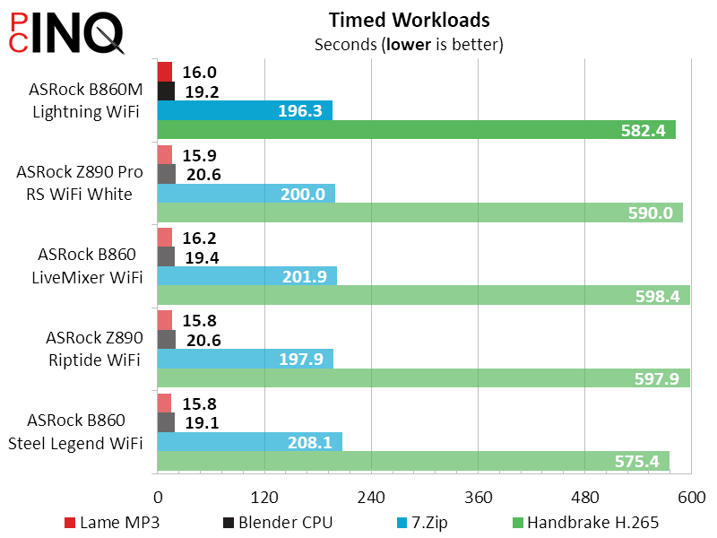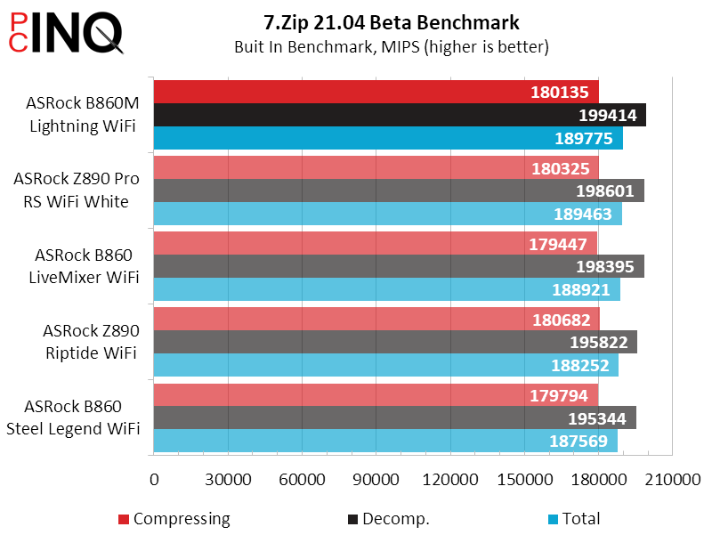 Primarily a measure of memory performance, 7.Zip’s synthetic test puts the B860M Lightning WiFi in the lead slightly, as confirmed in our real-world test in the bottom chart. The board otherwise appears to take second place to the B860 Steel Legend WiFi.