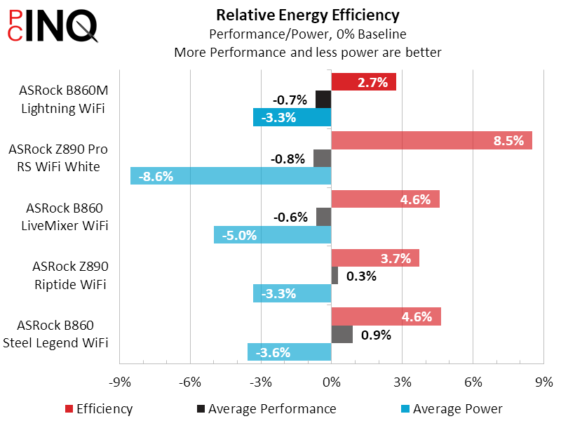 The B860M Lightning WiFi’s power consumption appears slightly high, but not by a disturbing amount. It’s matched by the Z890 Riptide WiFi. Using the first LGA-1851 board we tested as a baseline, we find the B860M Lightning WiFi having the least efficiency gained.