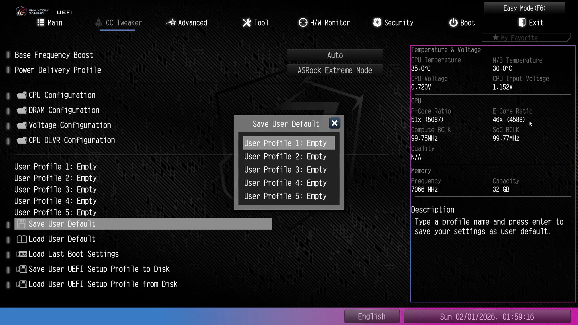 The B860M Lightning WiFi gives us five registers to store our changes as user profiles, allowing us to save something now, continue tuning until the new settings don’t work, and then return to saved settings. There’s also options to save and/or retrieve any of these “user profiles” to or from a USB drive.