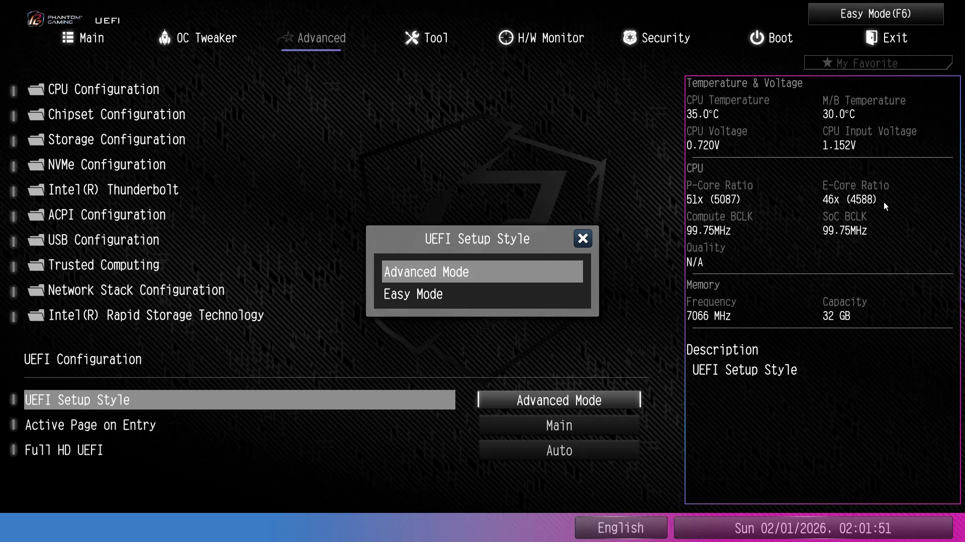 We changed the UEFI entry menu to Advanced Mode from the options of Advanced Mode’s “Advanced” menu.