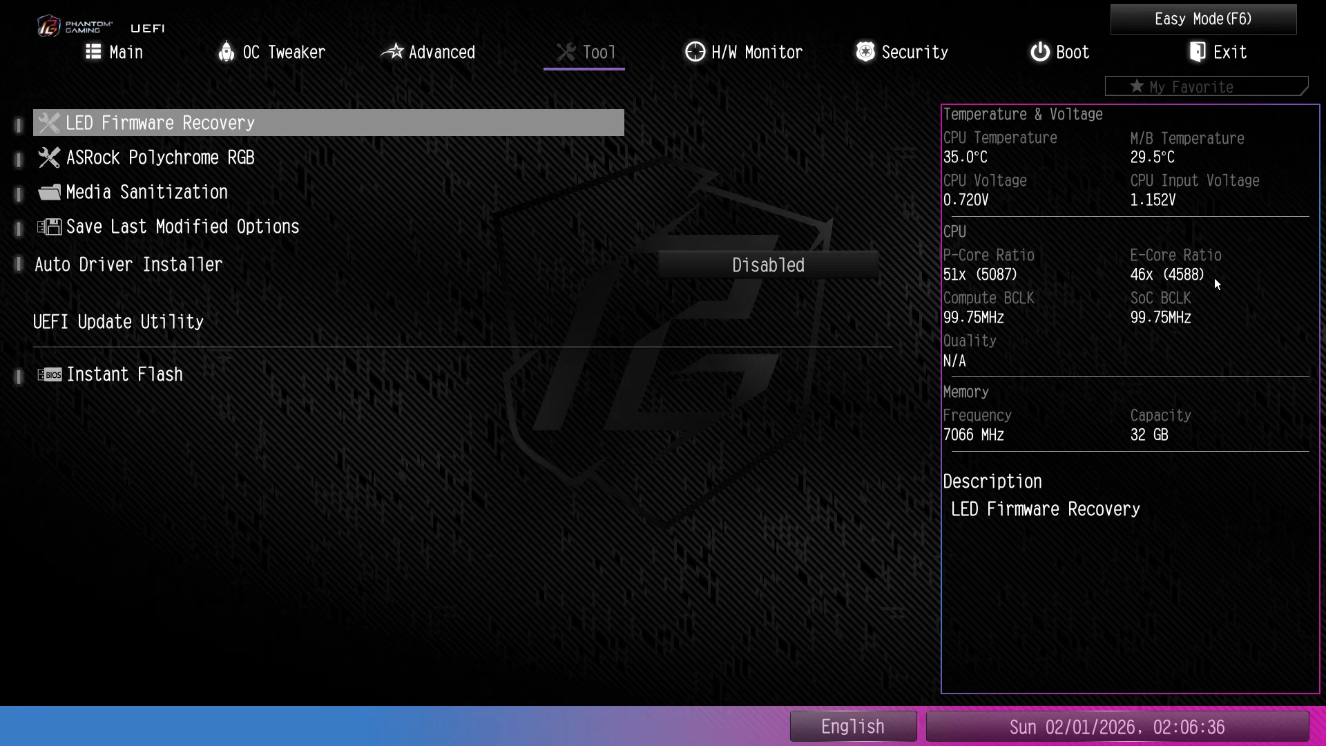 Tools from the correspondingly-named menu include a submenu for adjusting RGB settings and Instant Flash integrated firmware updating utility. Enabled by default, the “Auto Driver Installer” is designed to run once, turning itself off after offering to download drivers from the web. It waits until it detects an internet connection within Windows to execute that prompt, unless manually disabled here.
