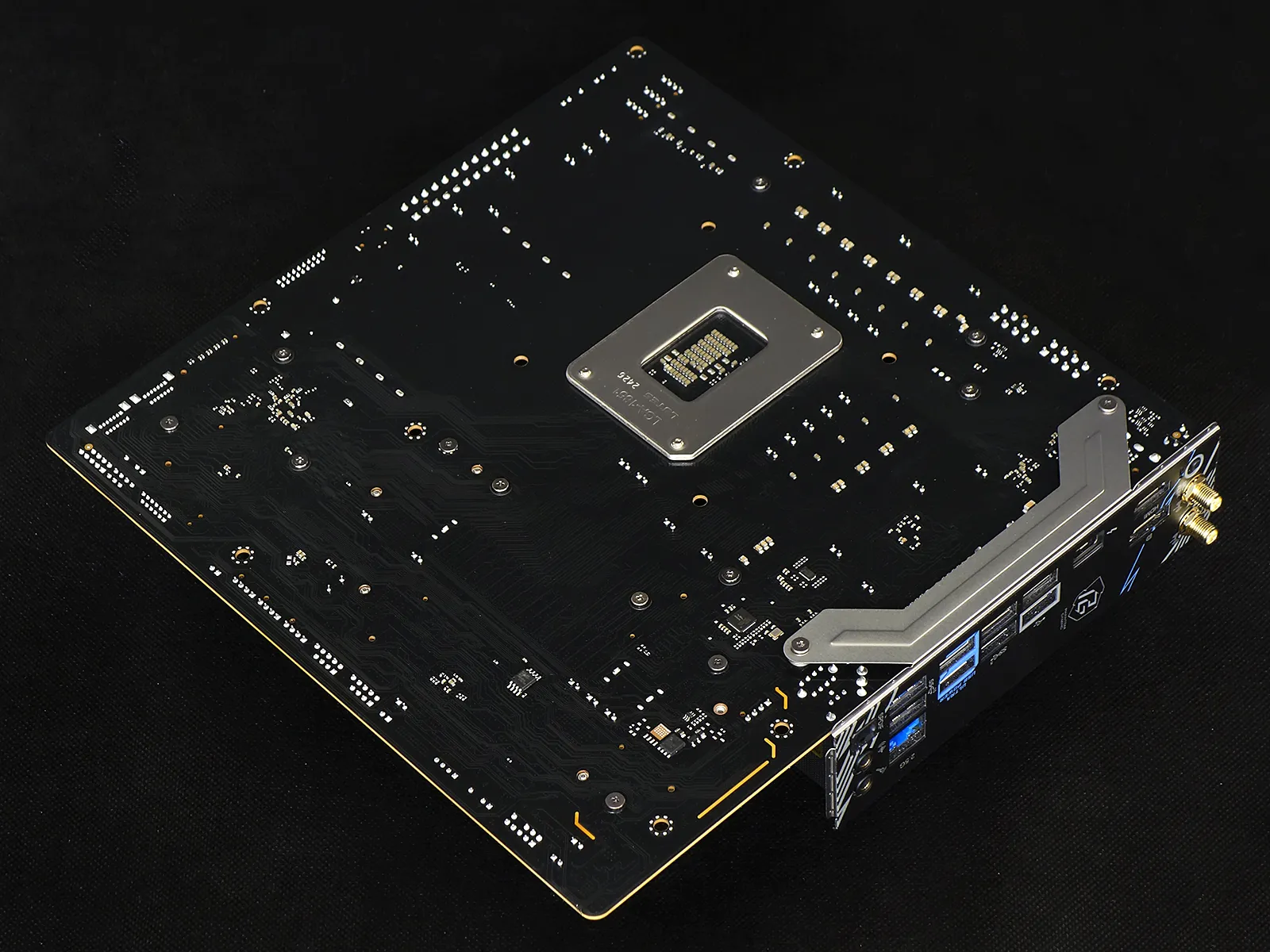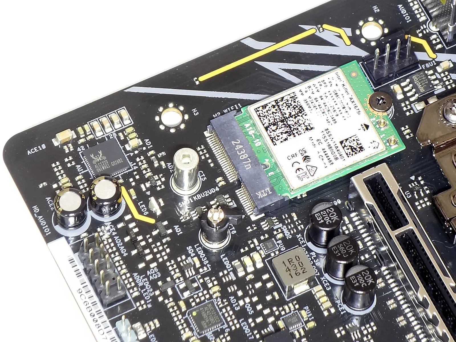 ASRock’s use of a classic ALC1220 audio codec is fine with us, as it supports more configurations at lower overhead with similar quality controls compared to the USB-based controllers found on certain higher-priced models. Next to it, the Killer AX1675i Wi-Fi 6E module uses Intel’s proprietary CNVio2 interface through a standard Key-E connector.
