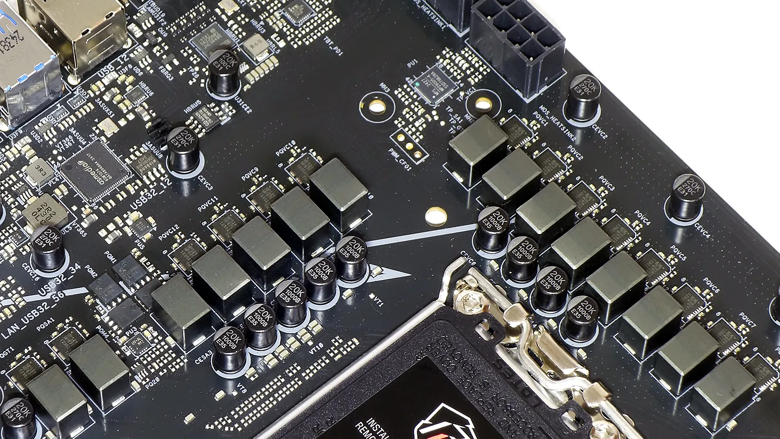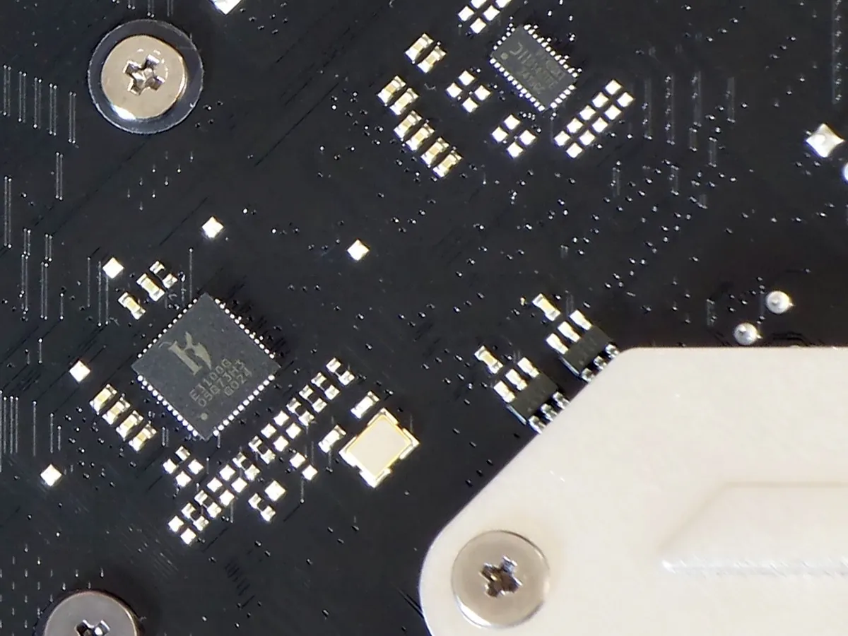 Fourteen MP87681 power stages each feed up 80A to the CPU from an MP29005-A controller, with various SM4508NHKPC 12A MOSFETs scattered about the rest of the board (including a group of four seen along the rear bank of power stages). Also visible behind the rear bank of regulators is the JHL9040R Thunderbolt 4 re-timer and a classic ASM1074 single-port to four-port USB 3.x Gen1 (5Gbps) hub. That’s right, a whole bunch of ports share a scant bit of bandwidth.