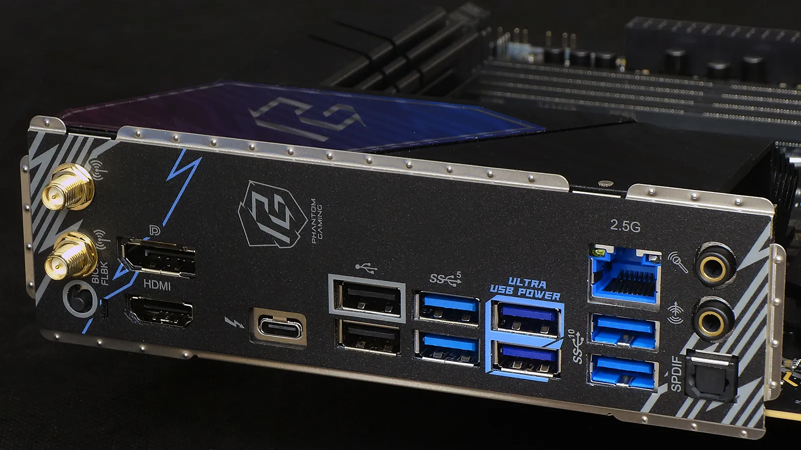 ATX and Micro ATX motherboards are the same size from the top slot to the top edge, so ASRock could have fit the B860M Lightning WiFi with the same ports as its ATX sibling: Instead, the smaller board loses one USB port and sees a placement swap for two others. It still gets two DisplayPort 1.4 outputs—one via Thunderbolt 4 protocol on USB4 Type-C—for CPU-integrated graphics, plus an HDMI 2.1, USB4 data (40Gbps) over the same Type-C connector, two 10Gbps and four 5Gbps USB3.2 Type-A ports, a 2.5GbE, two analog audio jacks, one digital optical audio output and a pair of old-fashioned USB 2.0.