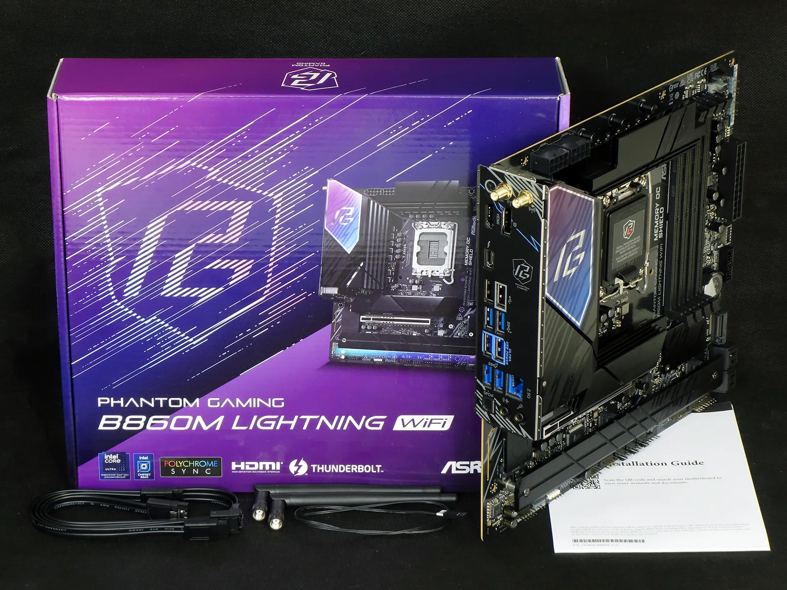 In addition to the motherboard, ASRock’s Phantom Gaming B860M Lightning WiFi includes a pair of SATA cables, a pair of WiFi antennas, a thermistor and an installation guide.