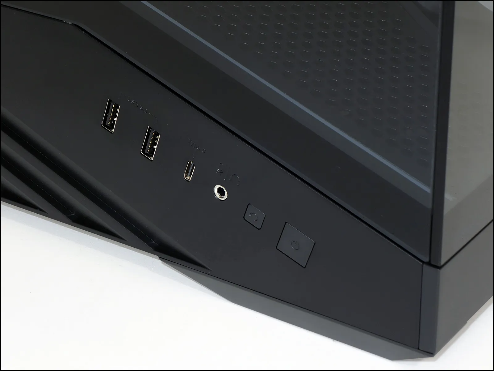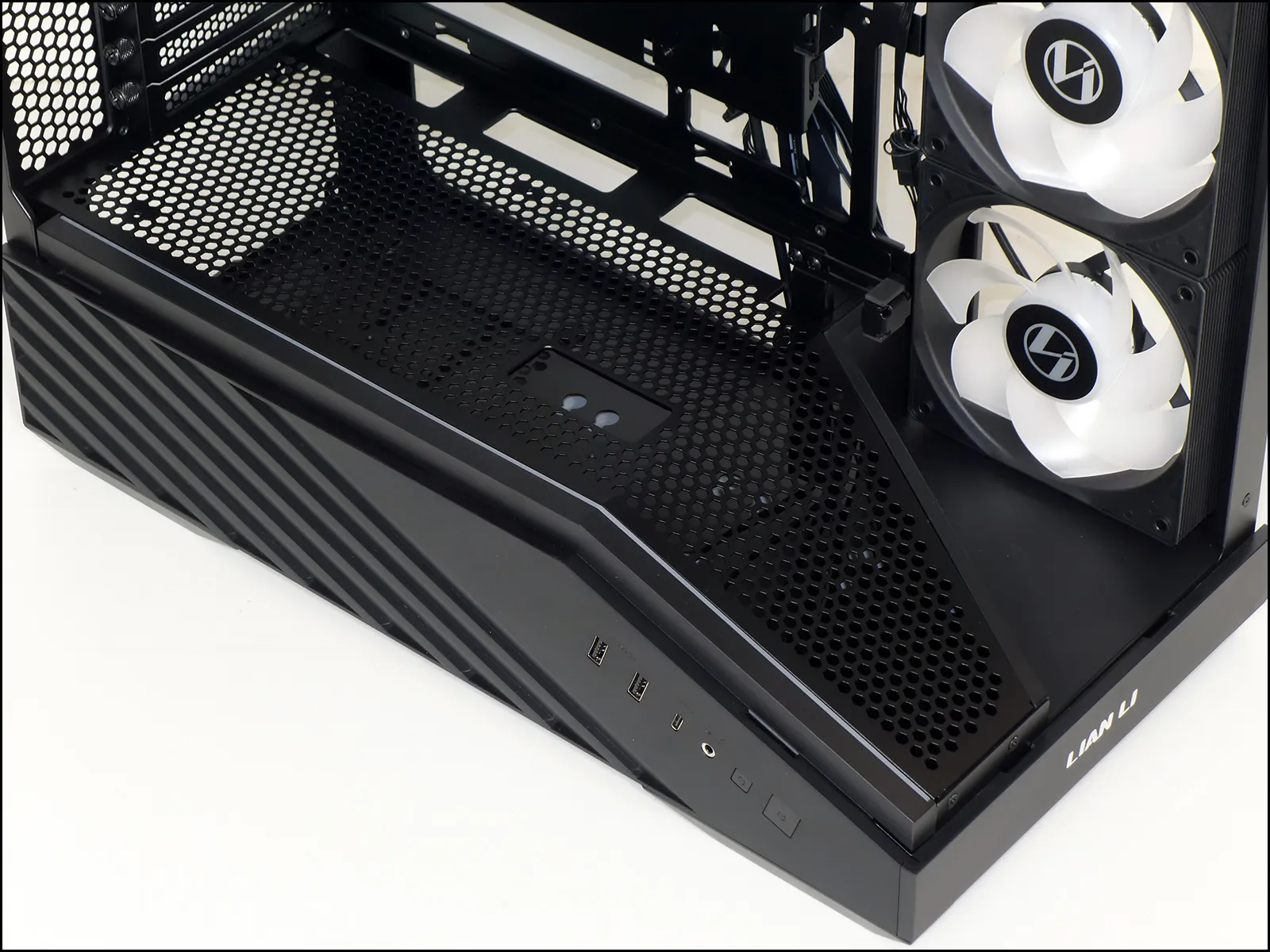 Front panel connectors are on the forward section of the lower left side, where we find two USB3 Type A ports connected to a Gen1 interface cable, a Type-C port connected for a Gen2x2 interface, and a headset combo jack that pairs stereo headphone output with monaural microphone input. For those unfamiliar, the microphone’s extra contact is located on a portion of the headphone’s ground barrel, so that the case’s jack can work with stereo headphones as well as headsets and headphone/microphone splitter cables.