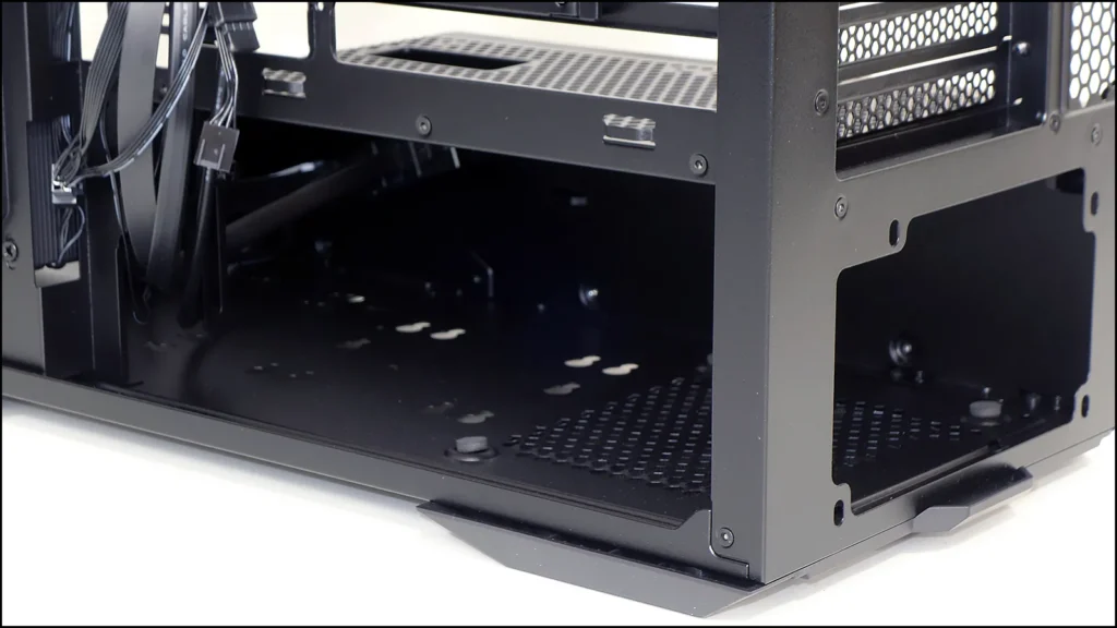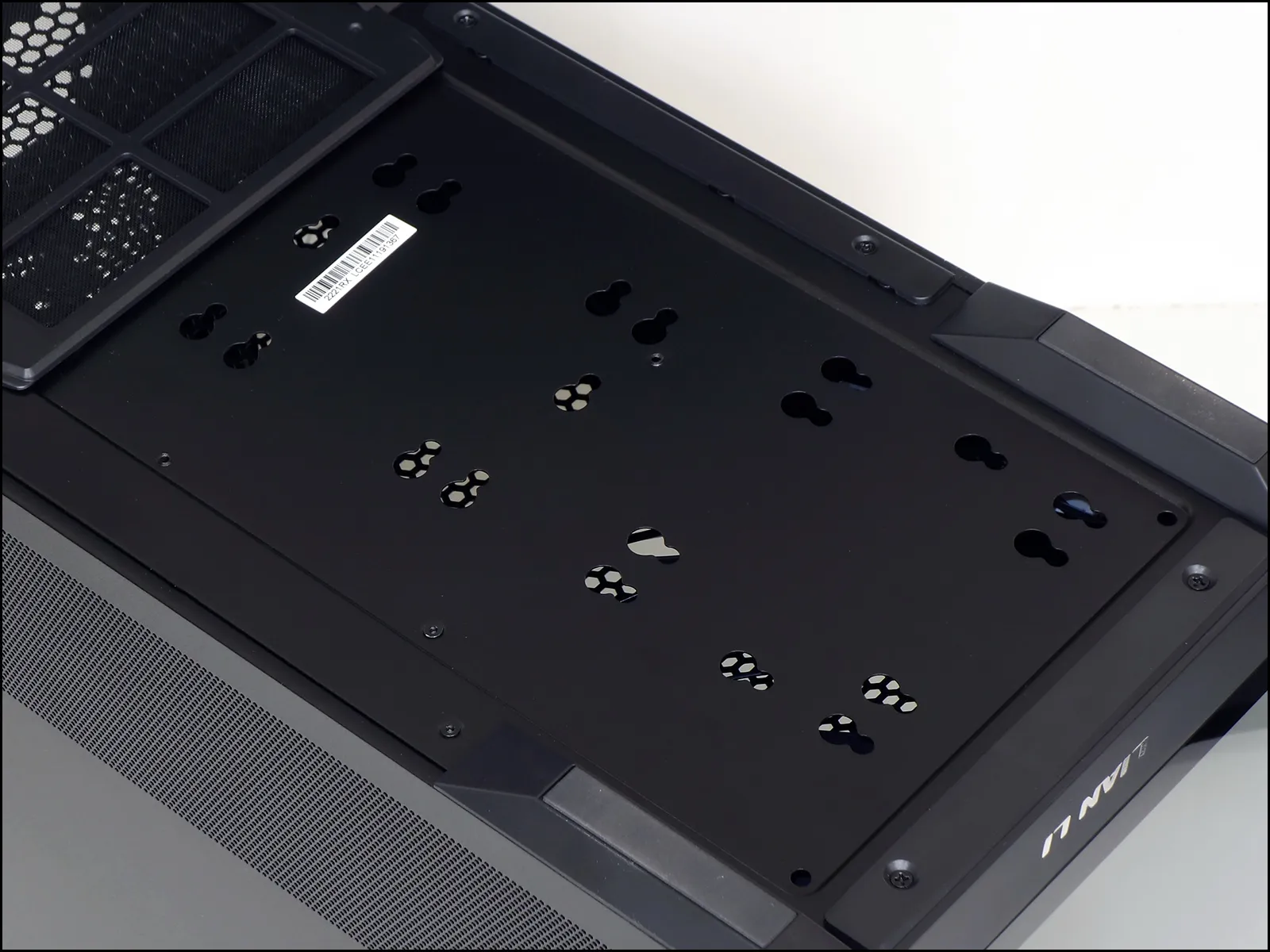 The bottom panel has a slide out dust filter that’s barely large enough to cover the power supply air inlet, and flipping the case reveals why: The rest of the bottom panel is covered with two sets of keyholes to allow drives to be mounted internally using rubber grommets and shoulder screws.