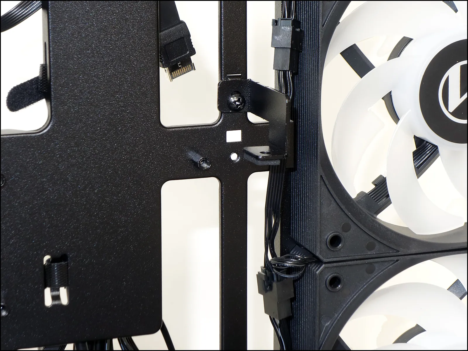 Because it’s fans and light bar have pass-through connections, the V100R Mini’s fans and lighting are able to connect to motherboard headers via a single ARGB and single PWM fan cable. A combined F-Panel block connects its power and reset buttons, an HD-Audio interface its headset combo jack, a 19-pin USB 3.x plug its two Type A ports and a Gen2x2 cable its Type-C port.