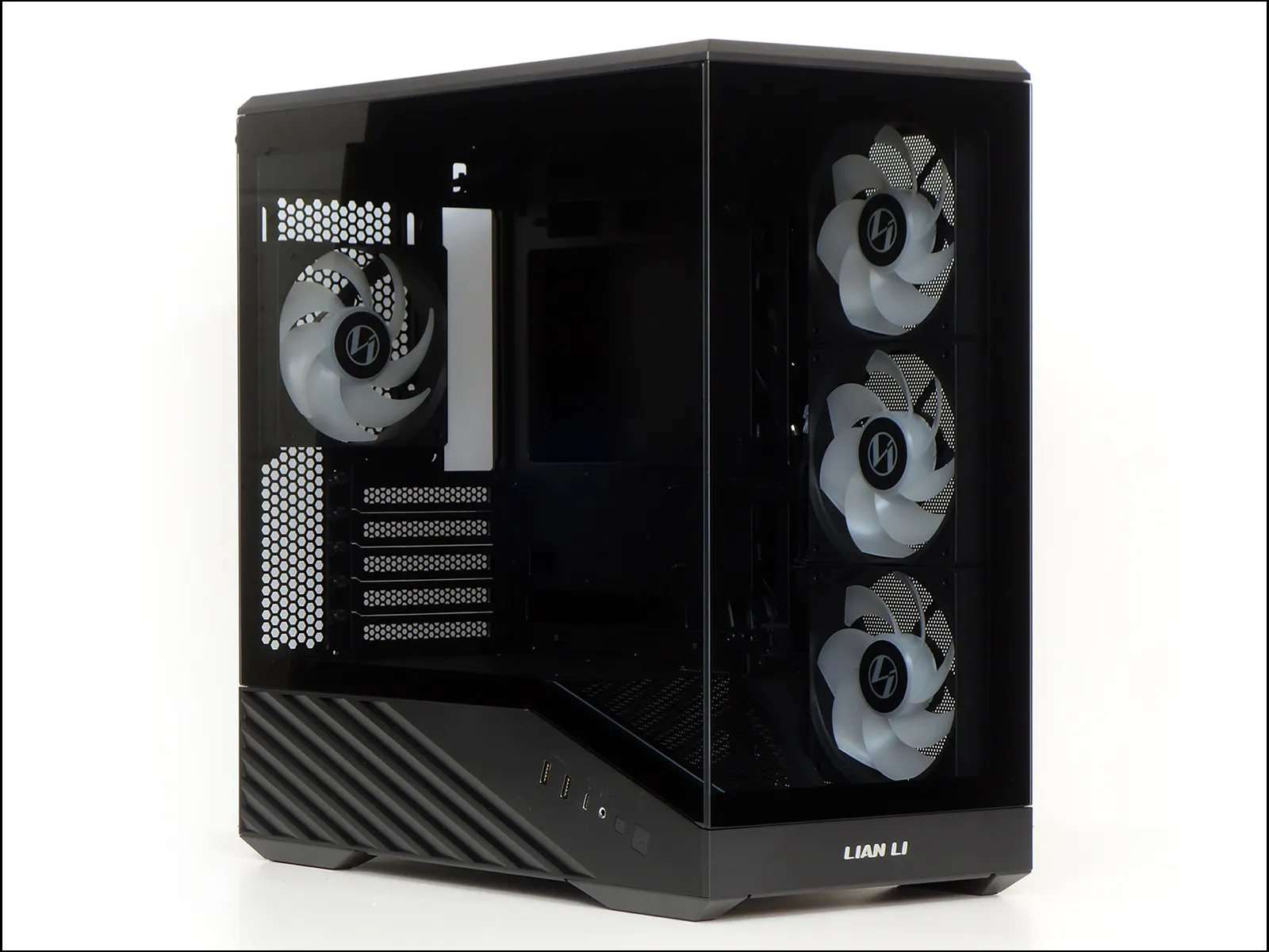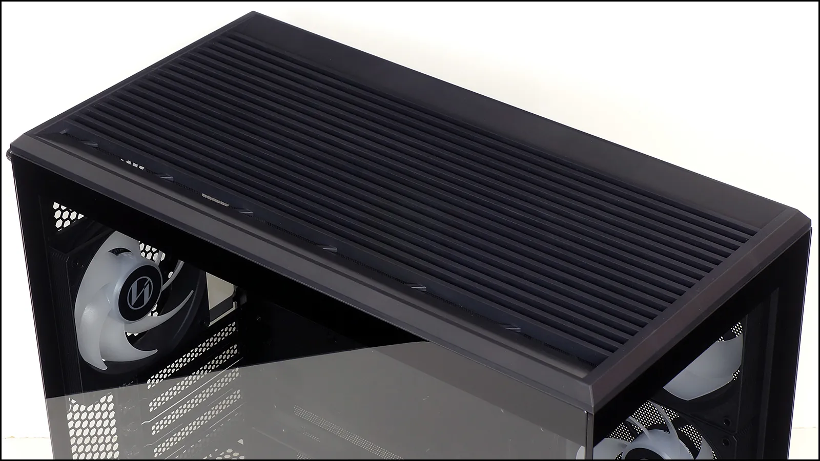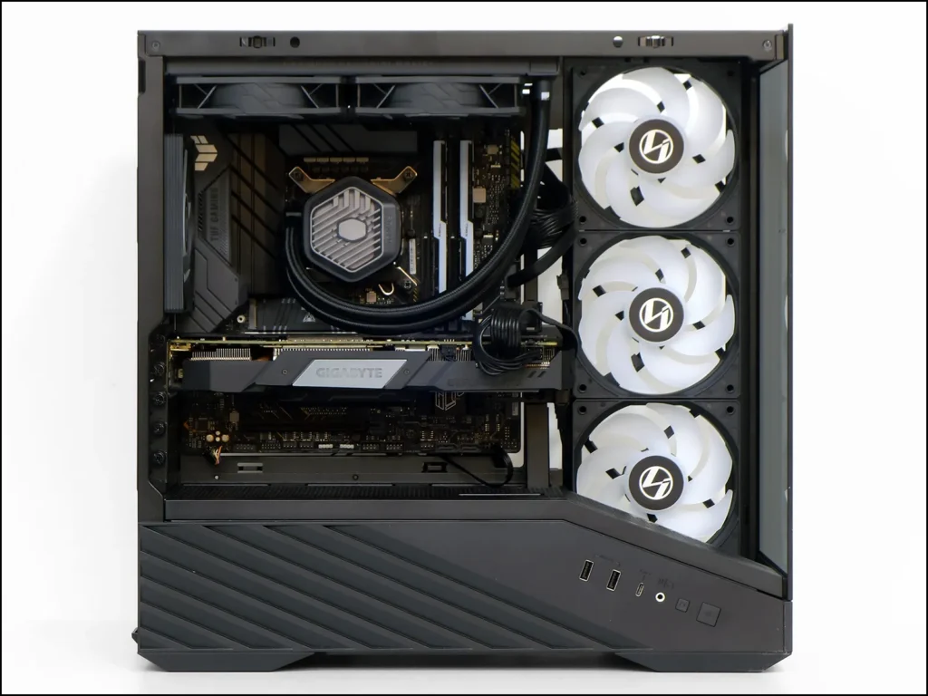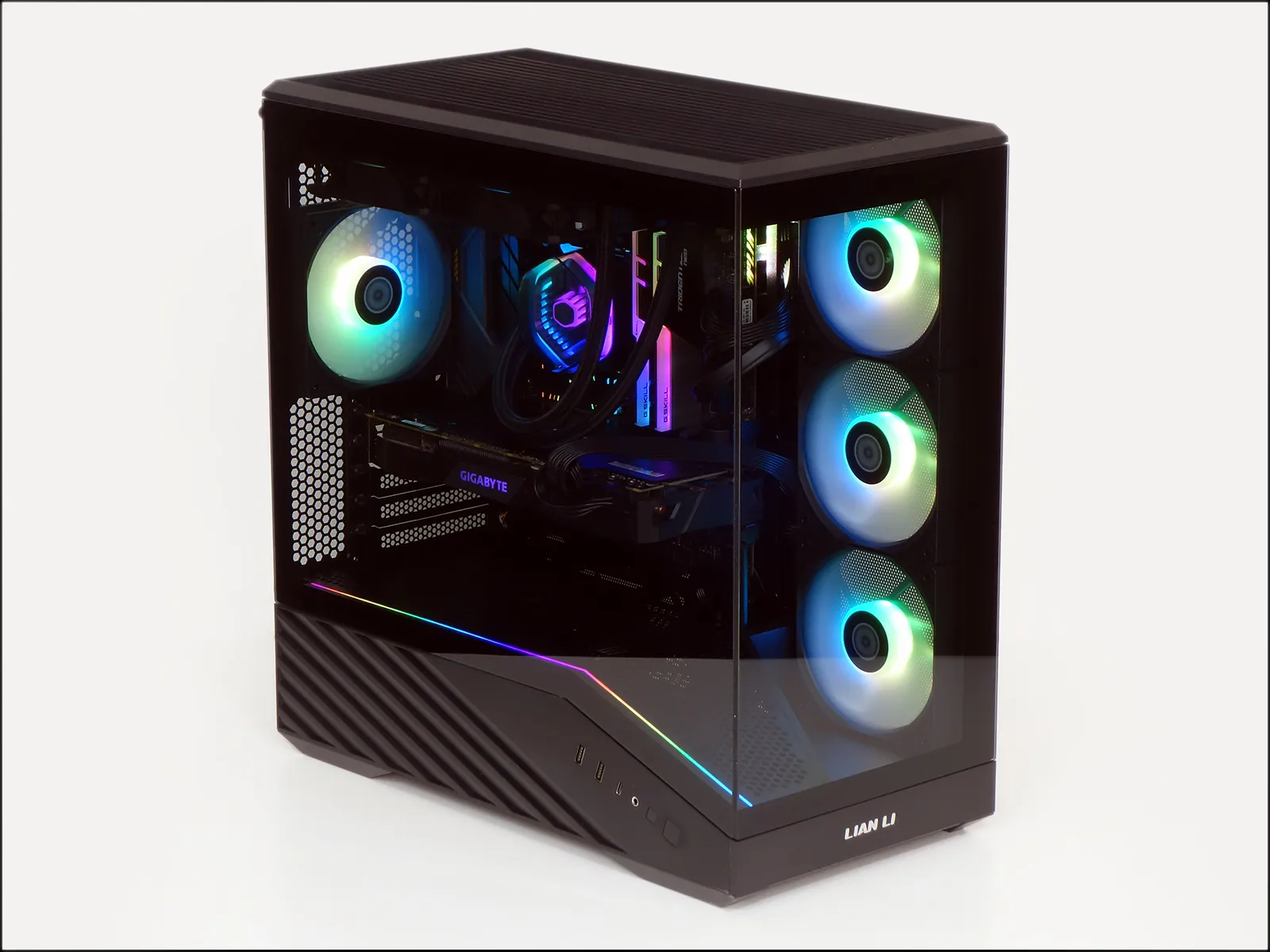 On the other hand, using a graphics card this small did give us a clear view of all three intake fans. With the system running, we can finally see the ARGB stripe that follows the left side of its power supply shroud.