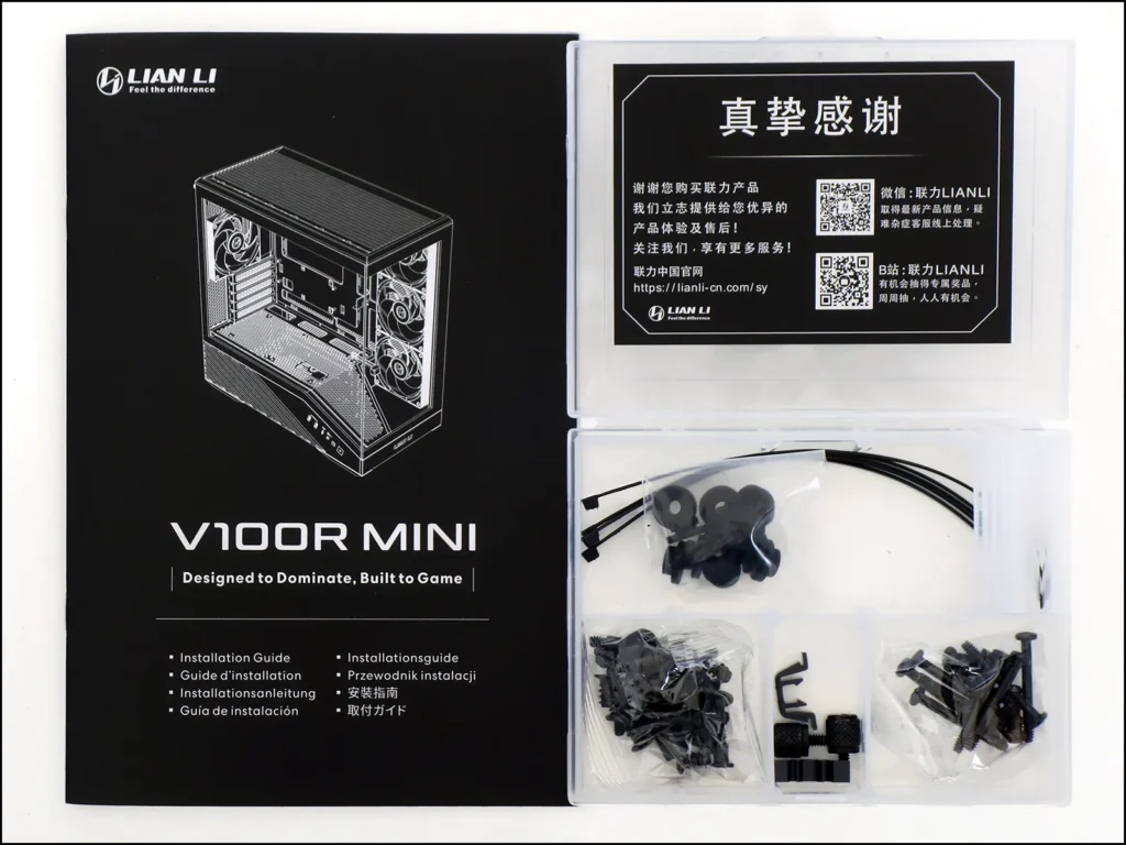 Boxed in a handy compartment tray, the V100R Mini’s installation kit contains five zip ties, eight grommets for installing drives to its bottom panel mounts, six #6-32 and eight M3 shoulder screws to match the mounting grommets, four #6-32 power supply mounting screws, twelve M3 flange head screws for installing the motherboard and 2.5” drive behind it, a standoff socket with #2 Phillips drive, sixteen coarse thread screws for fan mounting, two replacement snaps for the top panel and/or top edges of the side panels, two knurled screws and eight long-shaft screws for mounting two 120mm fans to the top of the power supply shroud.