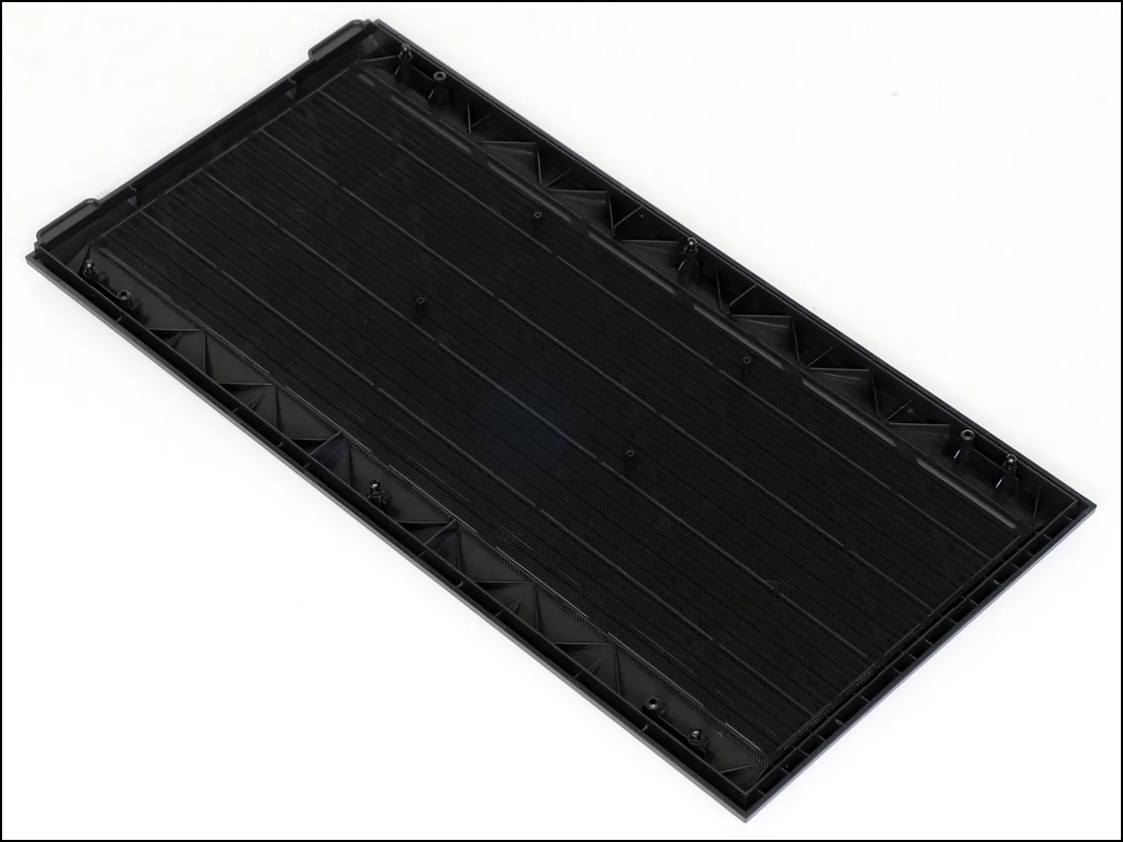 The rigid plastic top’s six fasteners snap away from the metal chassis top to reveal a glued-on mesh sheet. That sheet should probably be treated as a barrier that prevents small objects accidentally falling through the top grill bars rather than a filter, since it receives air from the side intake fans.