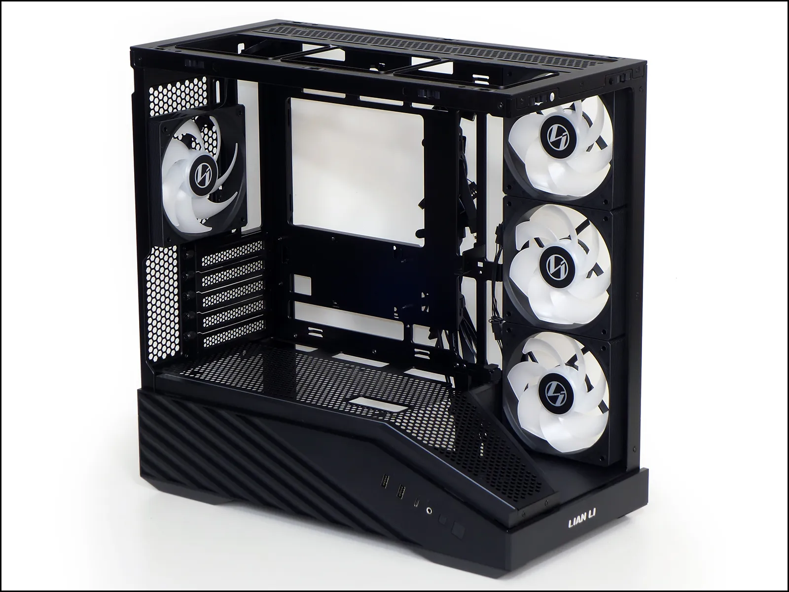 Around back are five expansion slots rather than the standard four of Micro ATX, as Lian Li wanted the case to support four slot graphics coolers regardless of whether the expansion slot was in the top position (which applies to most Micro ATX and all Mini ITX boards) or the second position (as designed into a few Micro ATX boards such as ASRock’s B860M Lightning WiFi).