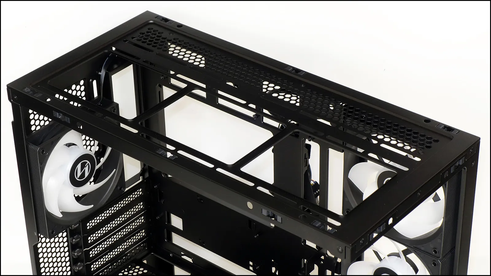 In addition to its cable passages, the top of the power supply shroud offers eight threaded holes for adding two 120mm fans: Since fan blades tend to make a bunch of noise when passing nearby vent holes, we’d suggest only using these mounts with the fan’s frame on the underside (even if you have to buy more reverse-flow fans to get the direction you want).
