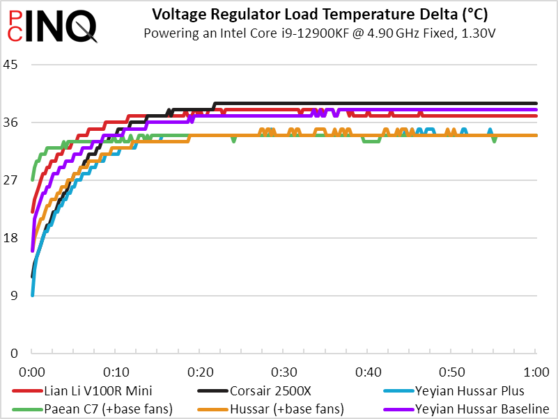 Things started to get toasty, but the V100R Mini finished in third place for voltage regulator temperature. This temperature is mostly affected by radiator and rear panel fan proximity.