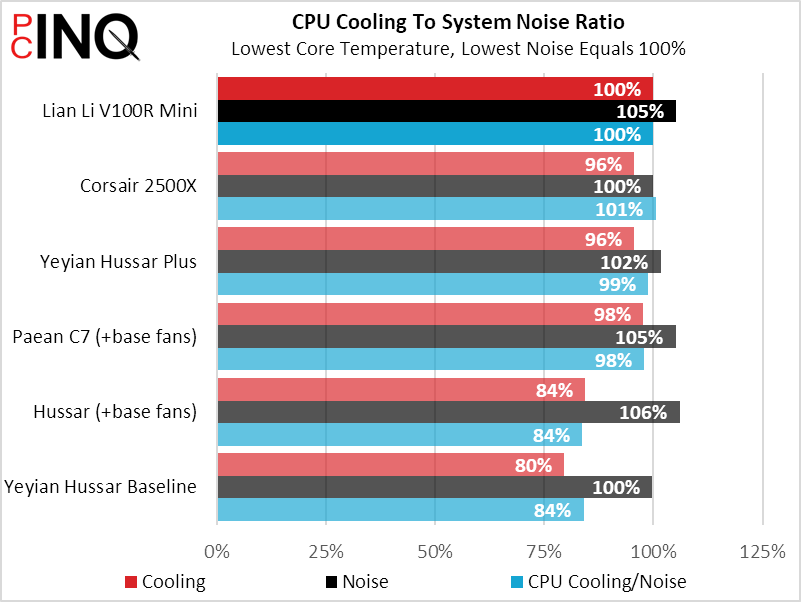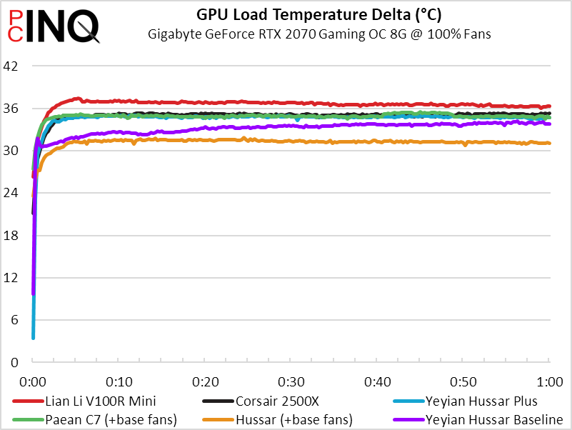 The V100R Mini surprised us by posting the lowest CPU temperature, which probably means that it’s triple intake fans are pushing a bunch of air to our top-mounted, exhaust-oriented closed-loop CPU cooler.